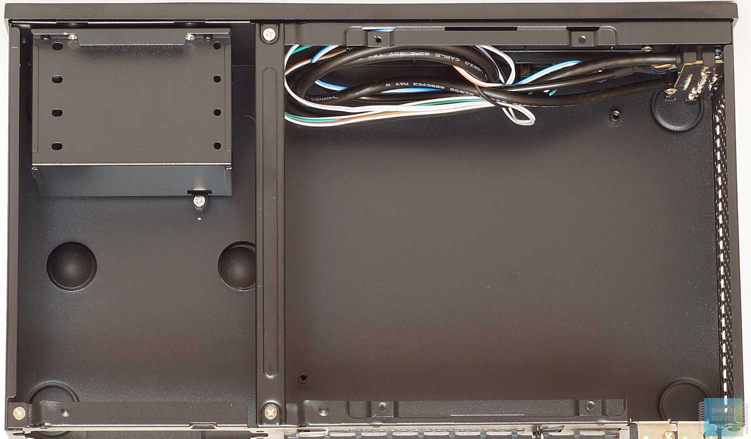 Оставшаяся область справа предназначена для установки mini-ITX/mini-DTX материнской платы. Ограничение по длине размещаемых плат расширения составляет 175.2 мм. Кстати, кабели крепятся к шасси корпуса со стороны передней панели.