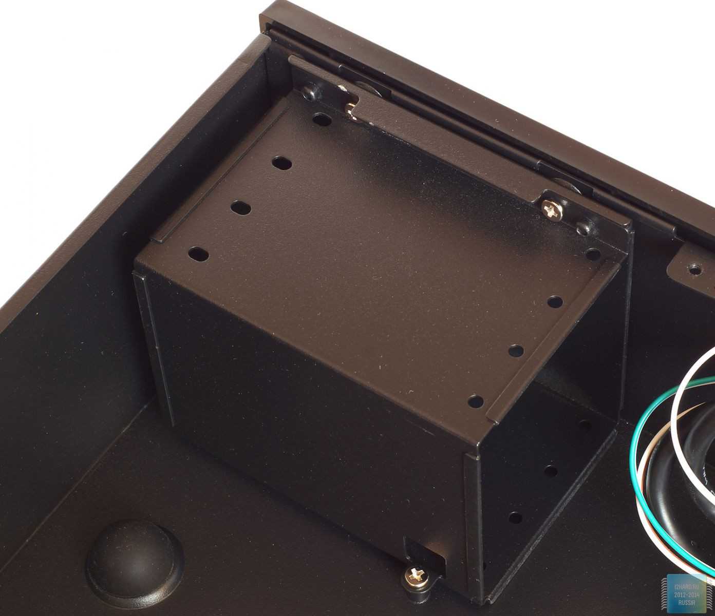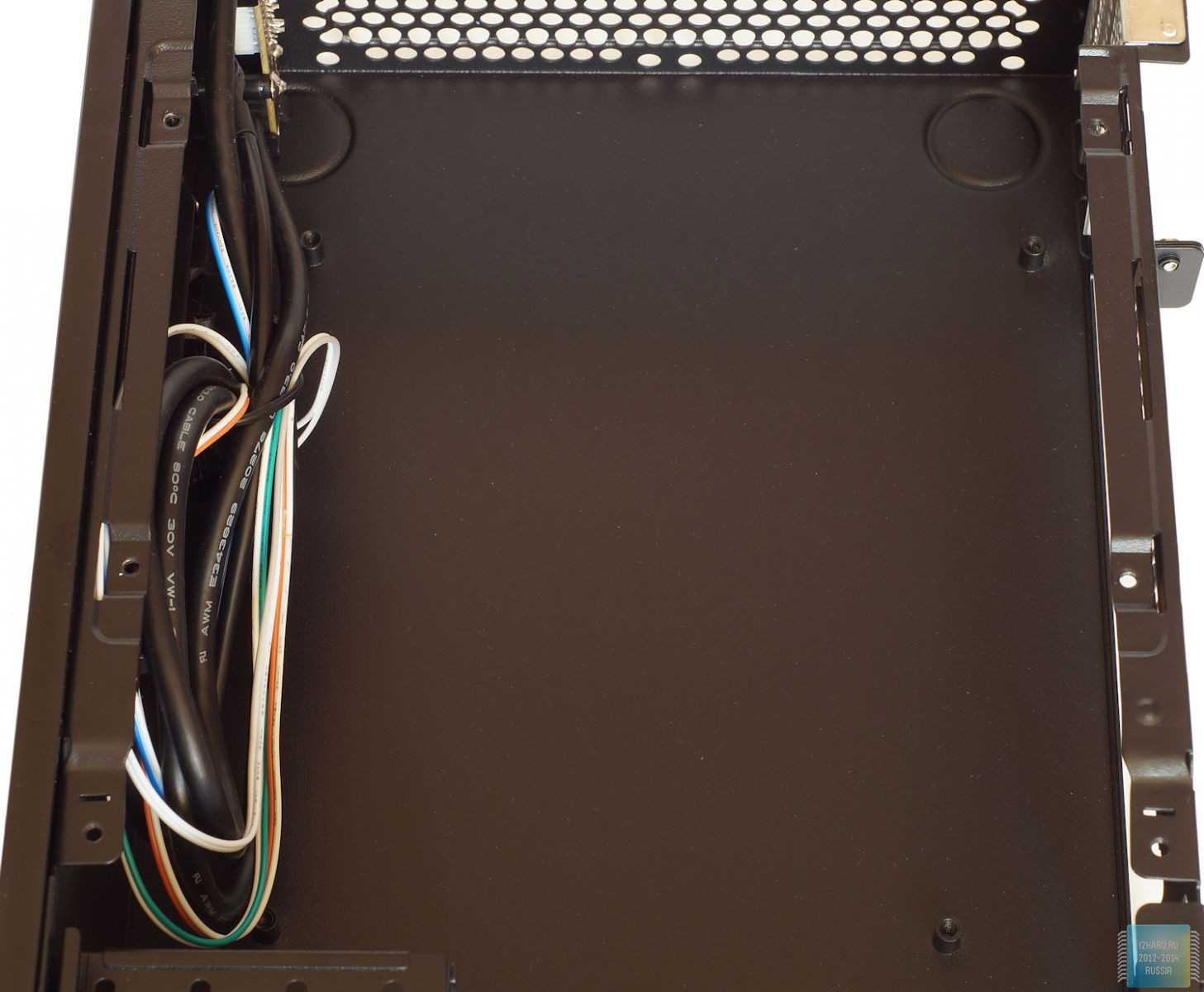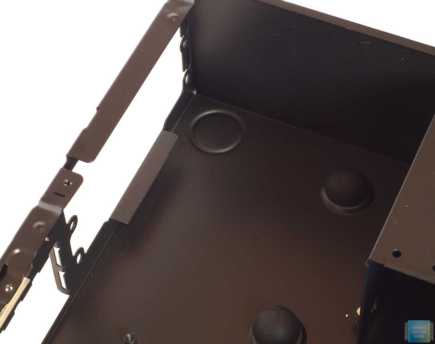 Жесткость корпуса обеспечивается как приличной толщиной стенок корпуса (0.8 мм), так и дополнительными элементами жесткости: центральной скобой около области блока питания с накопителями и многофункциональным кронштейном «4-в-1».