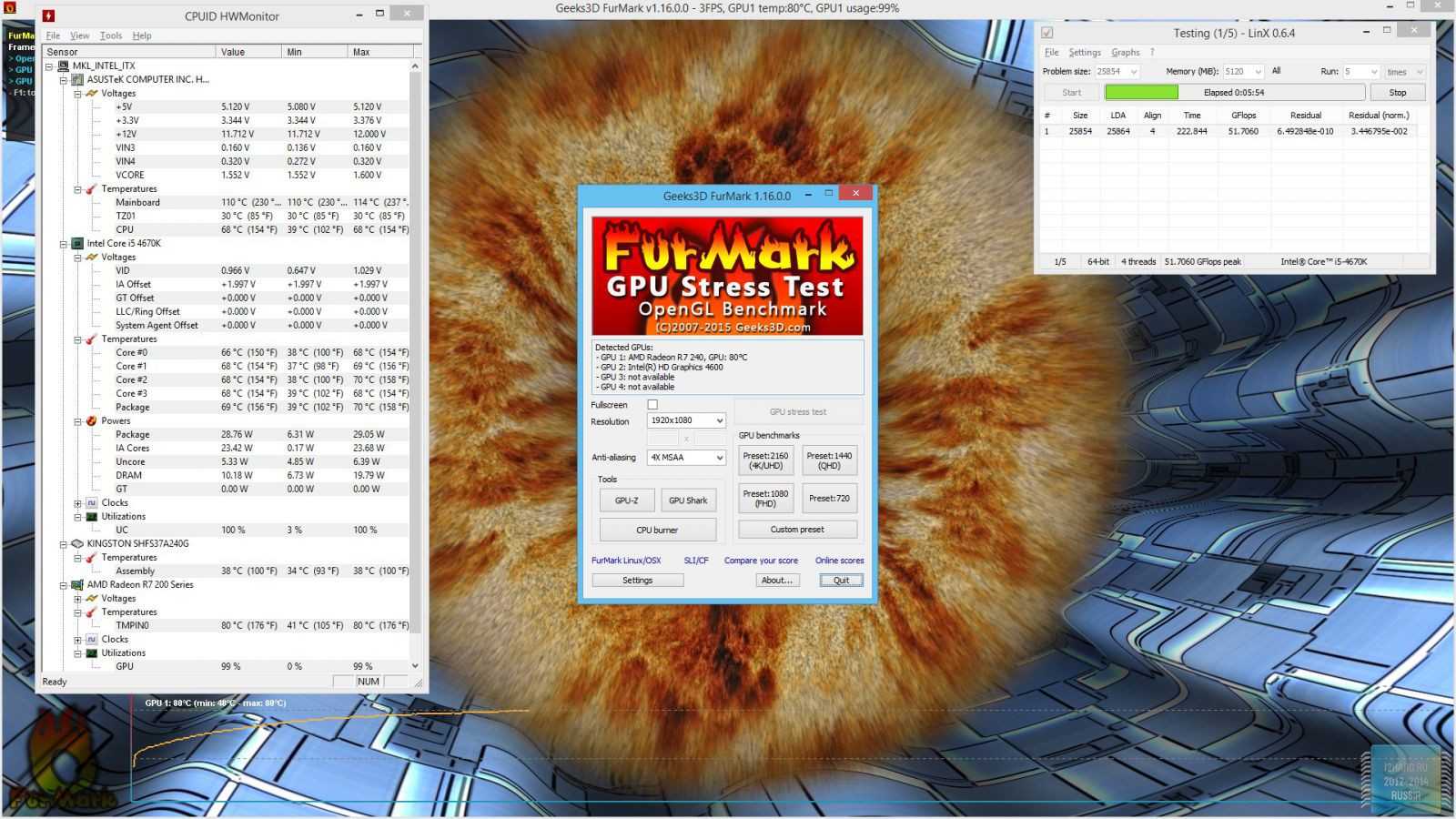 По температурам ядер процессора Intel Core i5 4670K (TDP 84 Вт) в разных режимах стоит сказать отдельно – под предельной нагрузкой LinX они получились достаточно высокие, а значит нужно изначально позаботиться о выборе подходящего процессора и системы охлаждения для него, способной разместиться в корпусе.