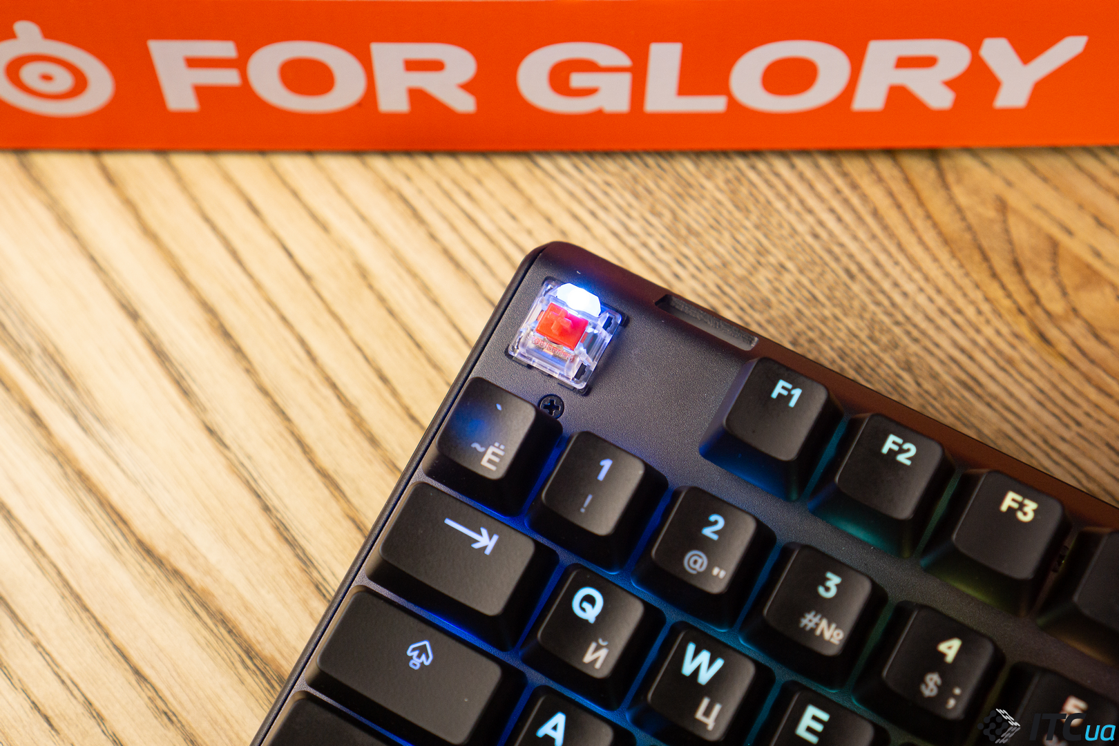 На тестировании побывала полностью локализованная раскладка клавиатуры с длинным левым Shift и одноэтажным Enter. Положение клавиш стандартное, без изменений. Из дополнительных элементов, кроме дисплея, можно выделить регулятор громкости и функциональную клавишу. Также, производителем была предусмотрена возможность быстрого запуска одного из 6 макросов, эта функция назначена на блок управления текстом и навигации при помощи сочетания с клавишей с логотипом SteelSeries.