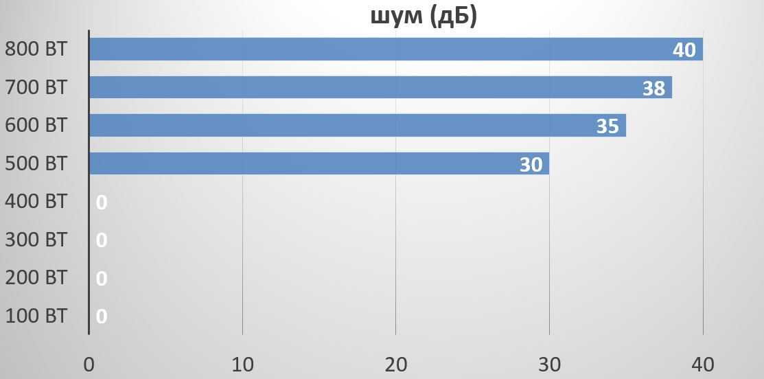 Вращаться в ECO-режиме вентиляторы начинают с нагрузки выше 400 Вт. С ростом нагрузки обороты растут до максимальных 1800 об/мин. Шум выше 30 дБ начинает фиксироваться прибором только от нагрузки 600 Вт, до этого вентилятор можно назвать бесшумным. Максимальные 40 дБ были зафиксированы на нагрузке 800 Вт.