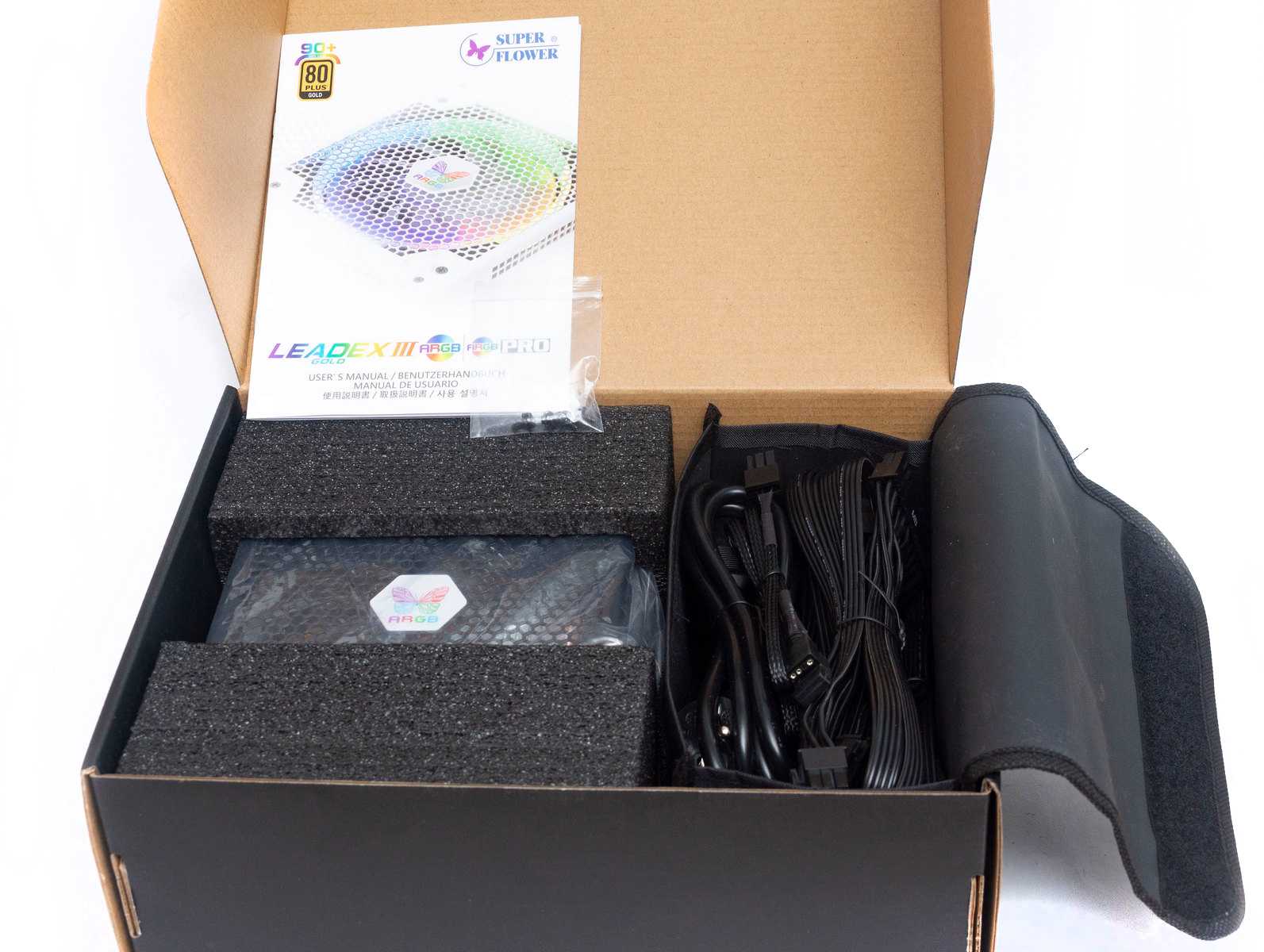Сам блок питания запакован в целлофан и зафиксирован демпферами из полиуретана. Все комплектные кабели упакованы в тканевом мешке с клапаном на липучке.