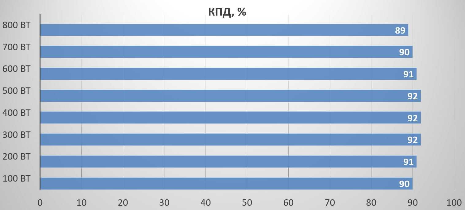 При максимально допустимой мощности в 400 Вт герой рейтинга способен выдавать более 90% от общей выходной мощности.