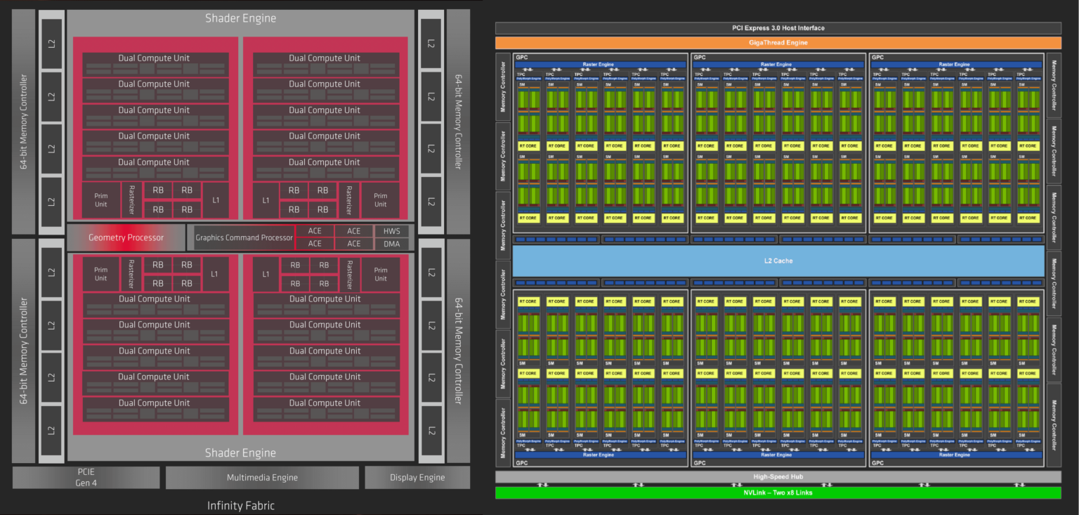 Рынок видеокарт для ПК и майнинг ферм разделён между АМД и Нвидиа. Компании давно сражаются за кошелёк покупателя, и предлагают собственные подходы к проектированию архитектур видеокарт. На картинке ниже, например, лицом к лицу встретились АМД Нави (слева) и Нвидиа Тьюринг (справа).