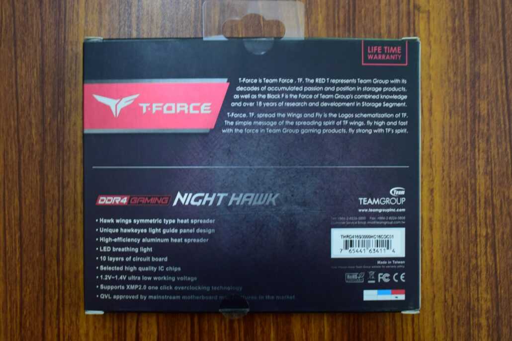 The back of the box lists down a brief overview of the T-Force brand along with detailed features of the T-Force Night Hawk series memory. The product label and contact details for Teamgroup are also provided. It’s mentioned that the kit comes with a lifetime warranty which is another plus for users building new DDR4 setups.