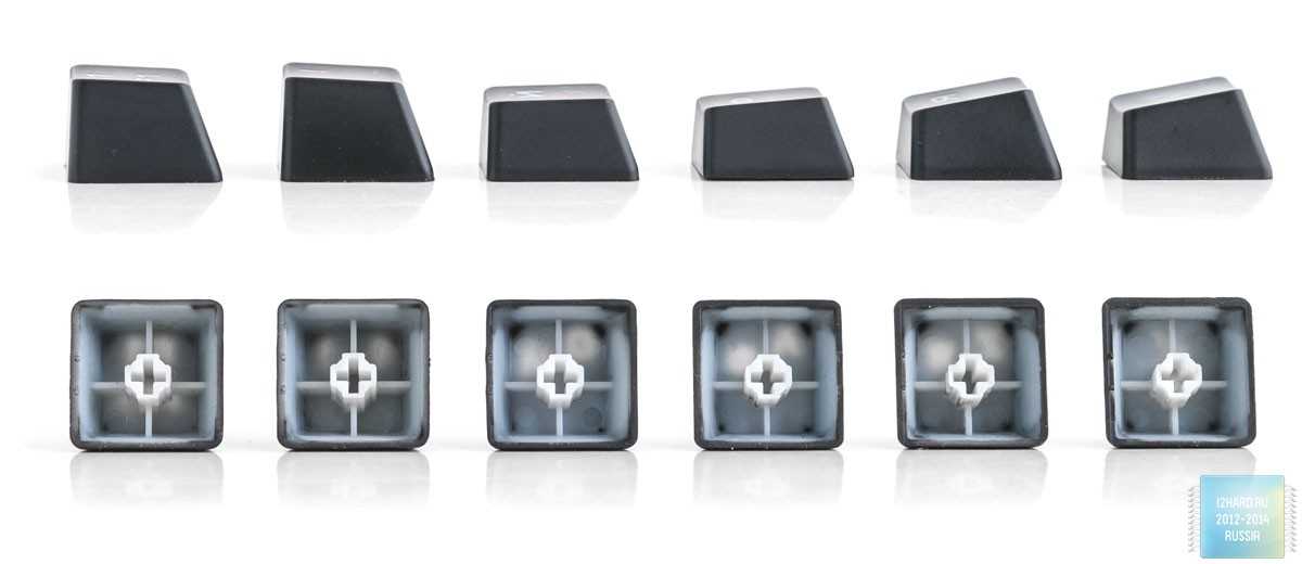 Колпачки выполнены изпрозрачного пластика иокрашены вчерный цвет, для шести рядов клавиш использованы четыре вида.