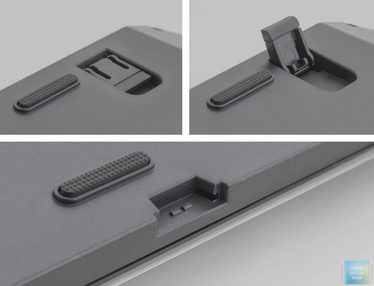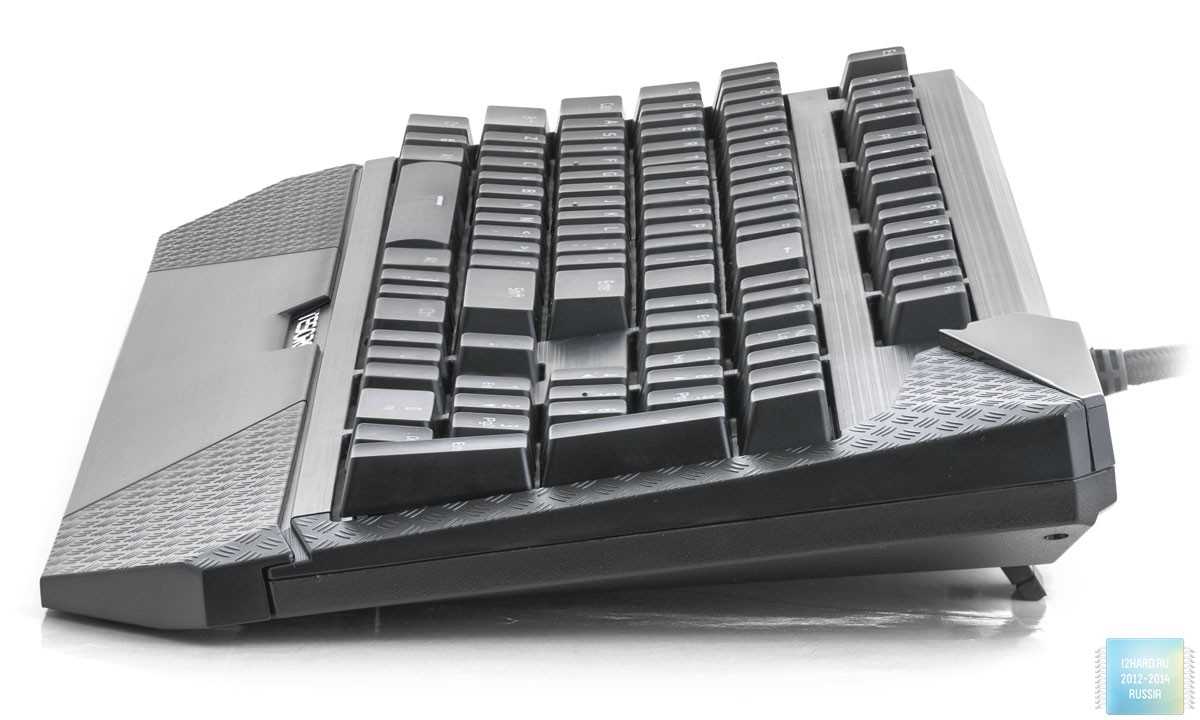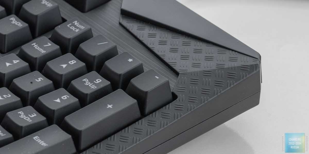 Вдоль переднего края расположены два углубления для фиксации съемной подставки под ладони.