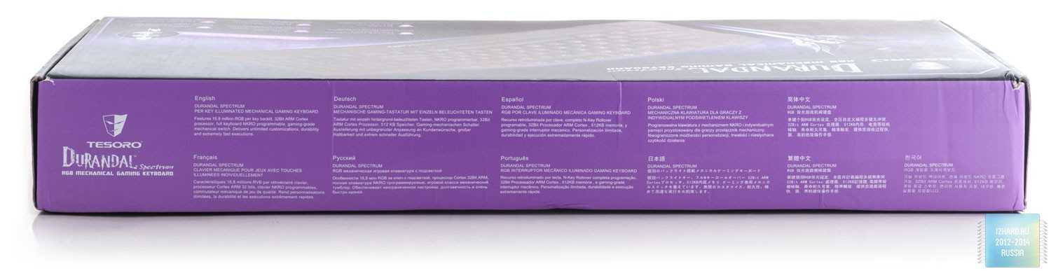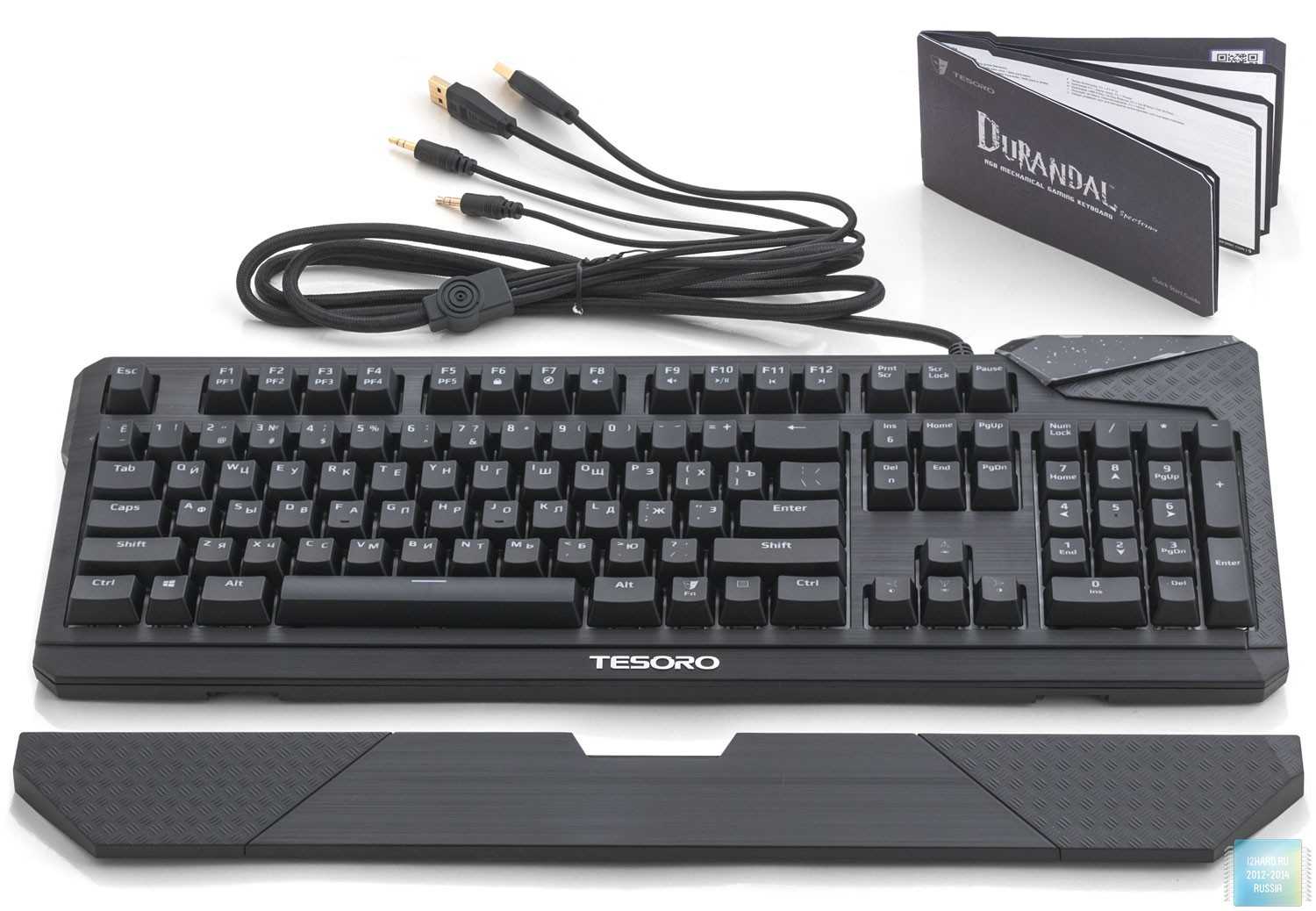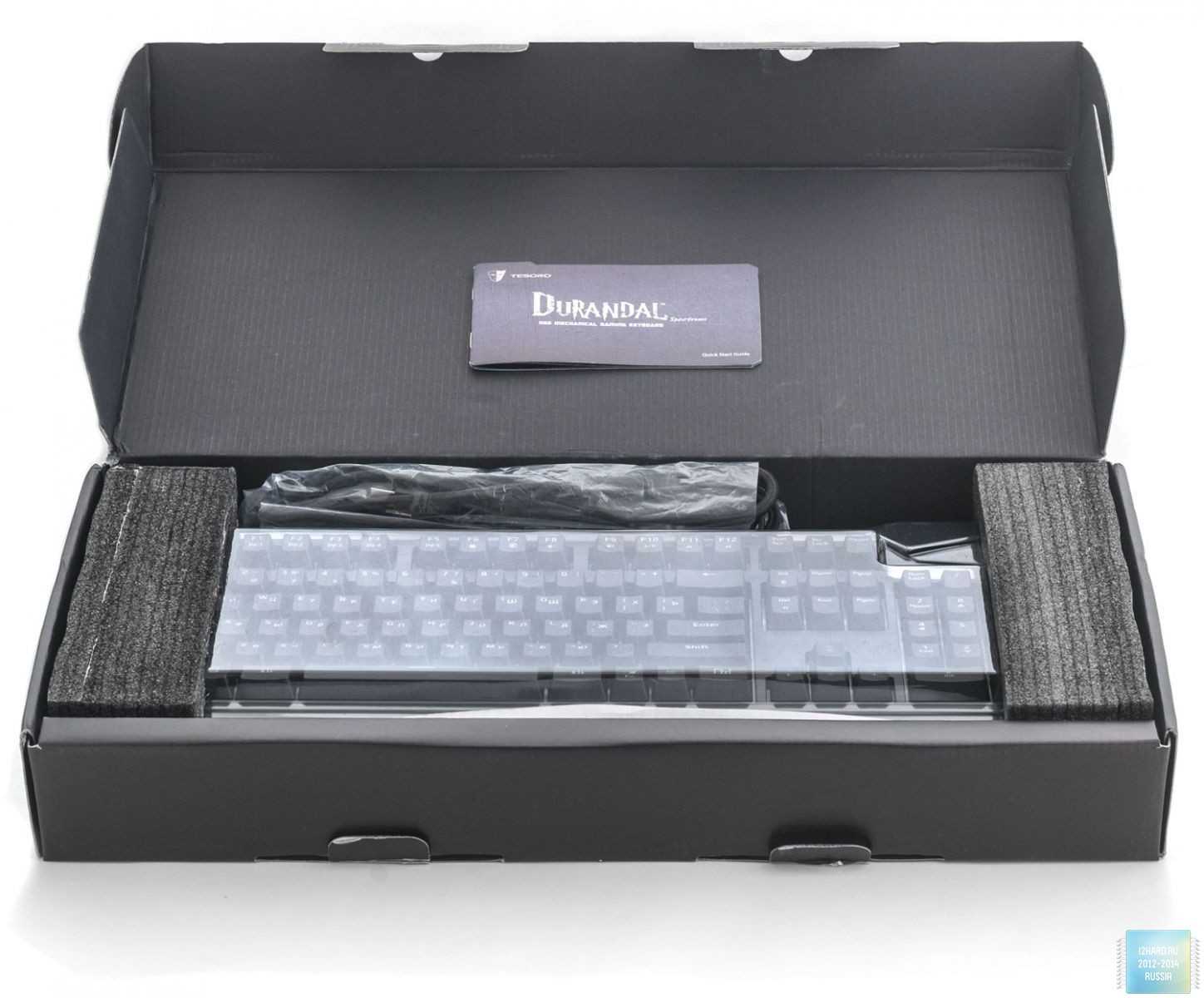 Комплектация состоит измеханической игровой клавиатуры Tesoro Durandal Spectrum, съемной подставки под ладони икраткой 16-страничной инструкции, переведенной на13языков.