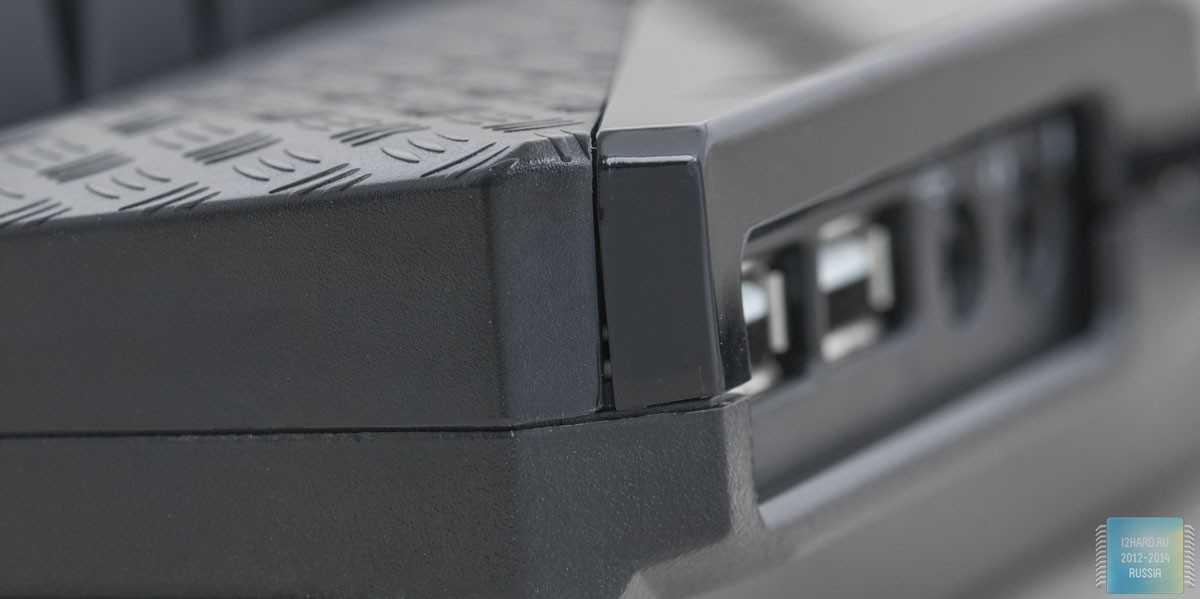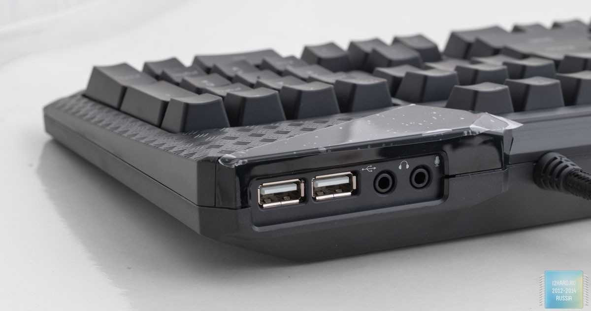 Концентратор состоит издвух портов USB 2.0 идвух мини-джеков для подключения наушников имикрофона. Провод подключения имеет общую длину 185см ирасположен непоцентру клавиатуры, арядом спортами расширения.