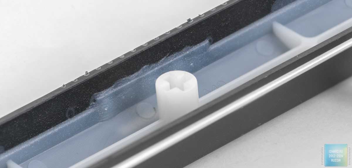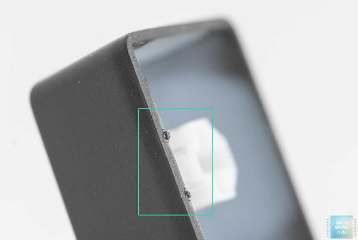 Несмотря нато, что корпус устройства обладает достаточной жесткостью, при попытке скручивания винтом урассматриваемого экземпляра обнаружился скрип вобласти панели индикаторов. Оказалось, что идентичный звук можно получить ипростым нажатием пальца напанель. При осмотре выяснилось, что плохо реализовано соединение между ней икорпусом устройства.