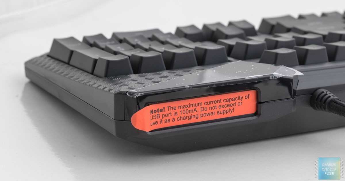 Напередней торцевой гране размещен стикер соштрих-кодами иуказателем типа установленных механических переключателей CherryMX, навыбор четыре варианта— Blue, Black, Brown или Red.