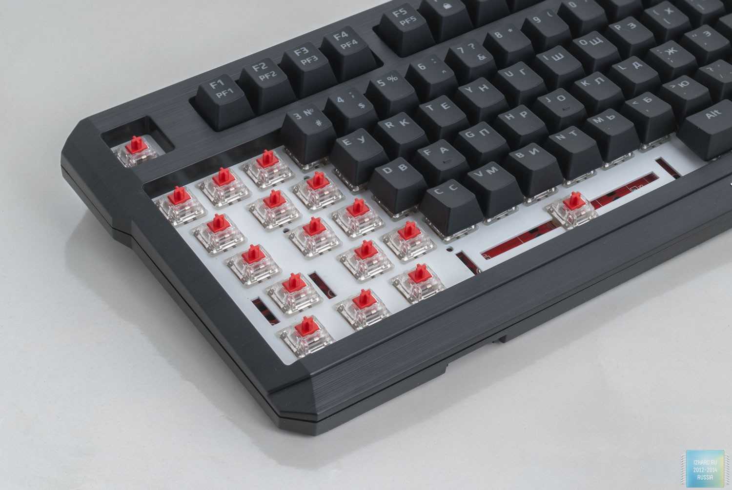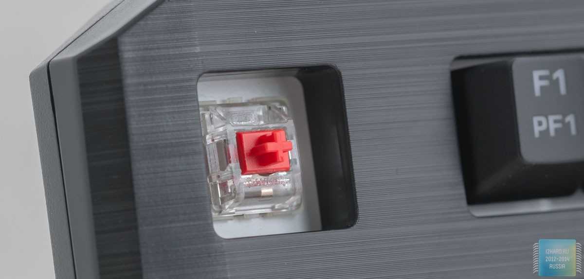 Вданной версии клавиатуры использованы переключатели Cherry MXRed, которые относятся клинейному типу итребуют наименьшую силу нажатия для срабатывания среди переключателей Cherry— 45г. Нажатия легкие, без тактильного отклика ищелчка, переключатели относятся кклассу игровых.