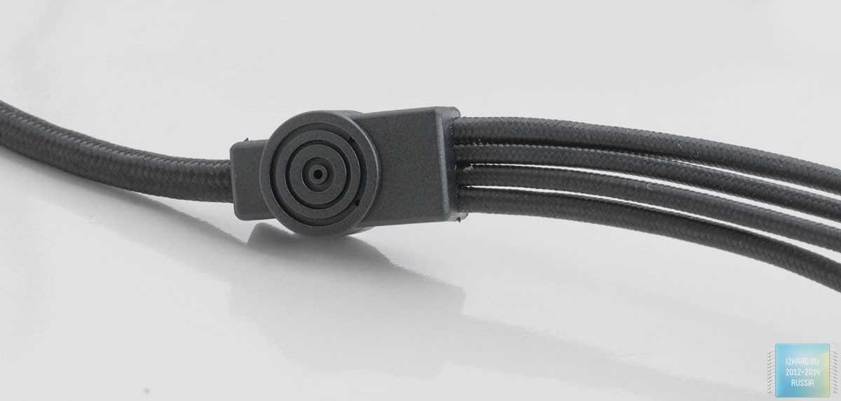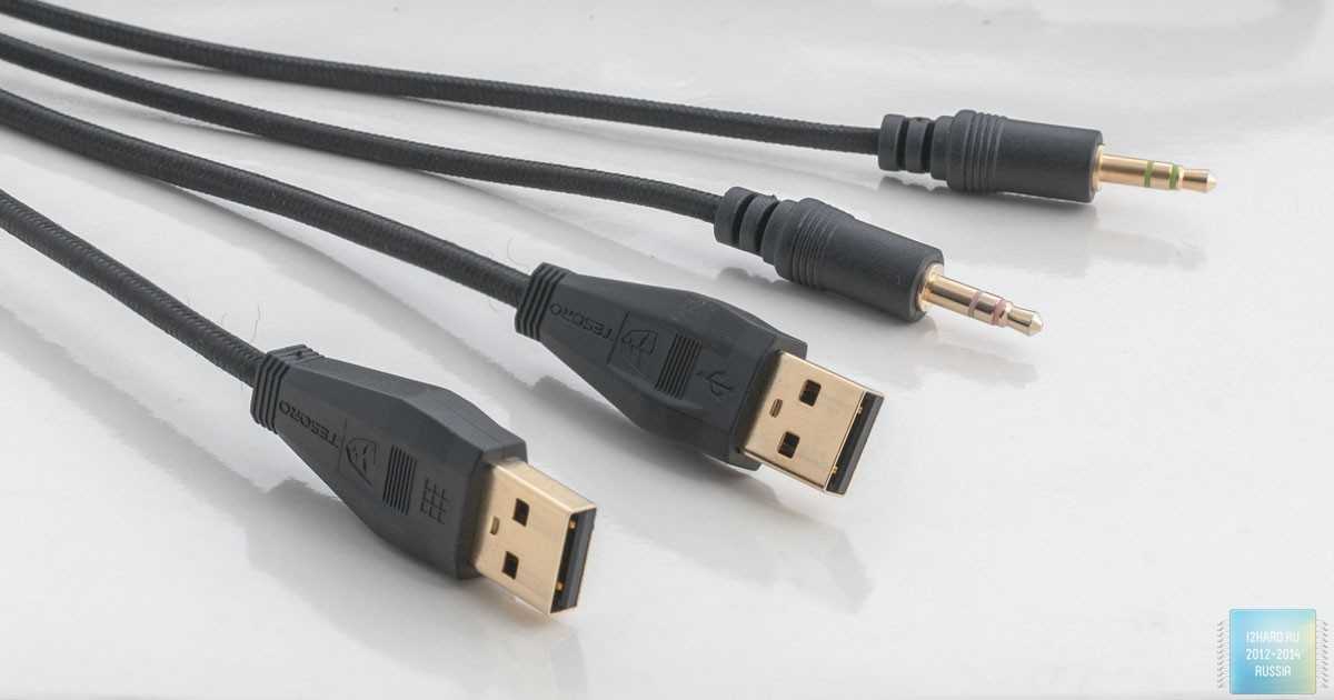 Оканчиваются кабели двумя позолоченными штекерами 3,5мм для микрофона инаушников (толщина проводов 3,2мм) идвумя позолоченными USB-коннекторами, один изкоторых для подключения клавиатуры, адругой— для питания двух USB портов (толщина проводов 4мм).