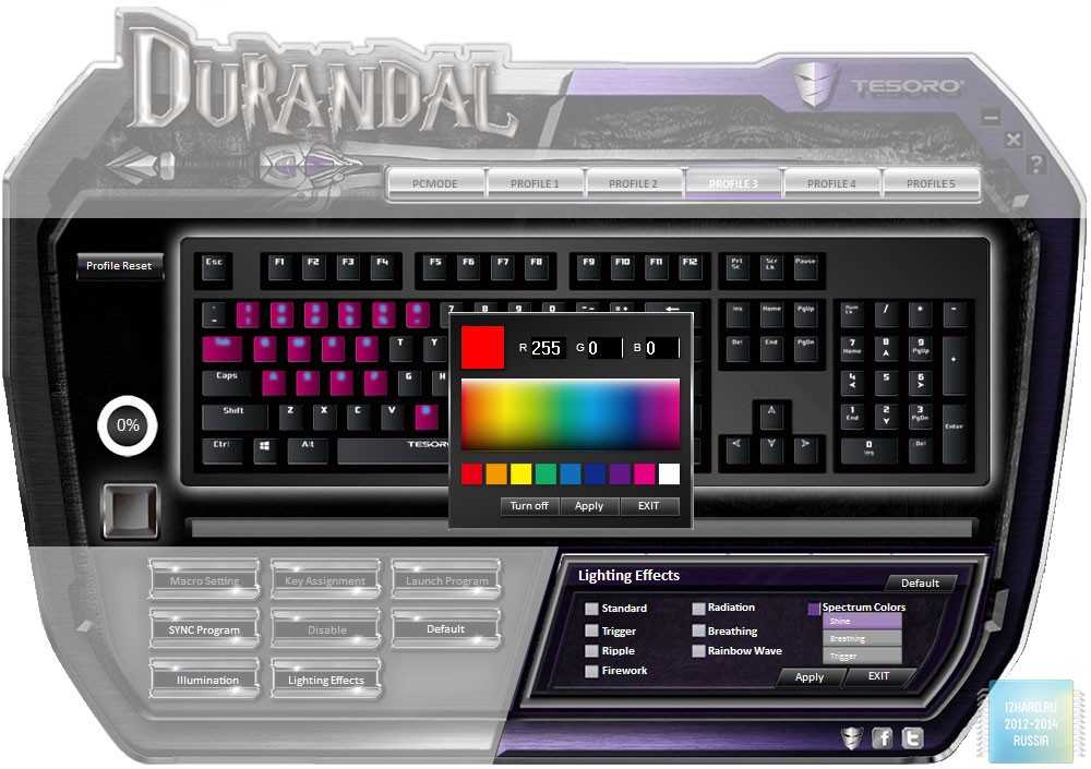 Заподсветку отвечают две вкладки. Вовкладке Illumination (иллюминация) выбирается цвет подсветки всей клавиатуры, который применяется для шести извосьми эффектов, авовкладке Lighting Effects выбирается желаемый эффект.