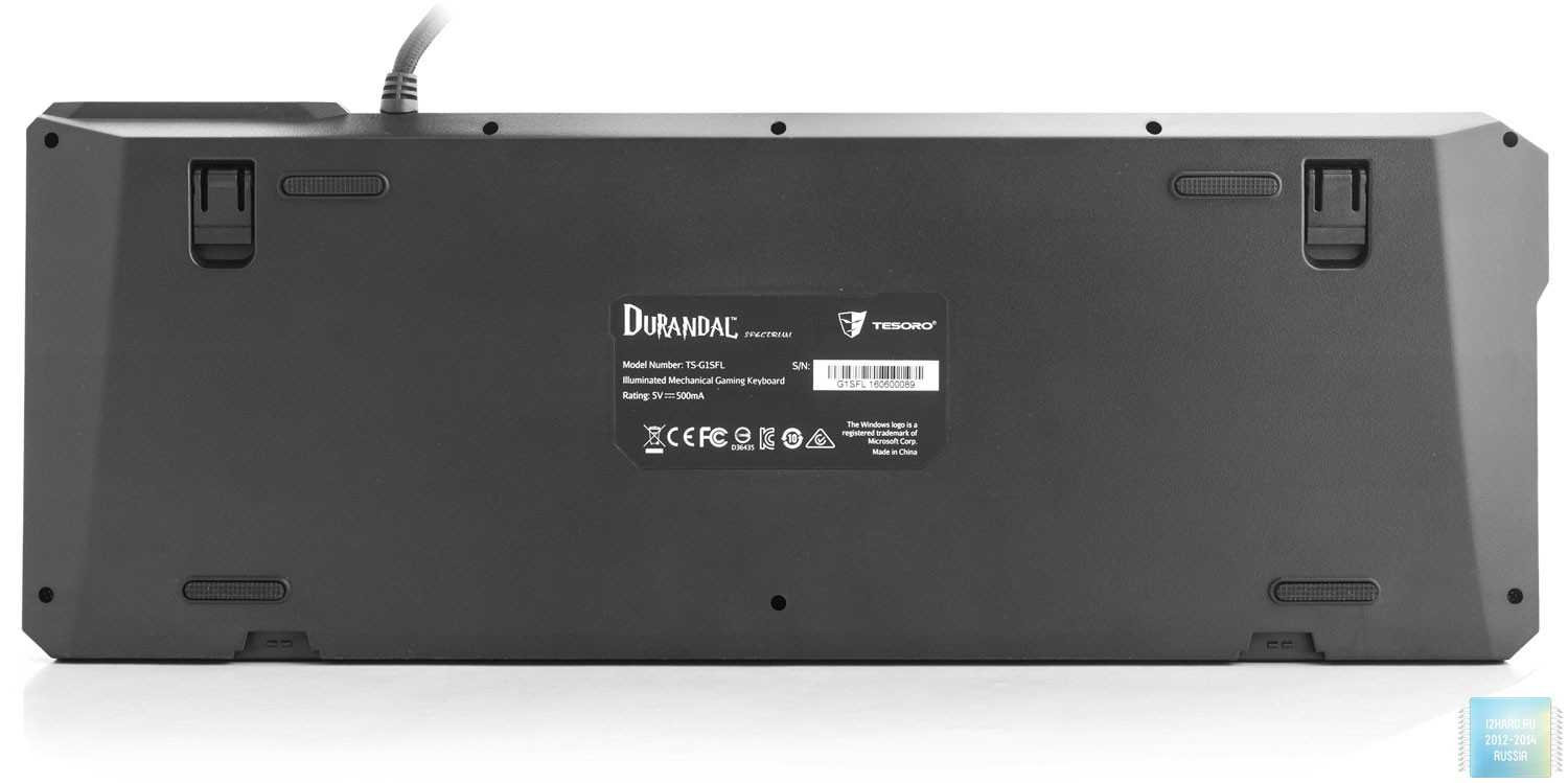 Вцентре основания клавиатуры расположен стикер, накотором помимо логотипа Tesoro иназвания устройства (Durandal Spectrum), указан номер модели (TS-G1SFL), серийный номер, вольт-амперные характеристики (5В, 500мА) истрана производства (Китай).