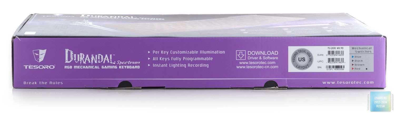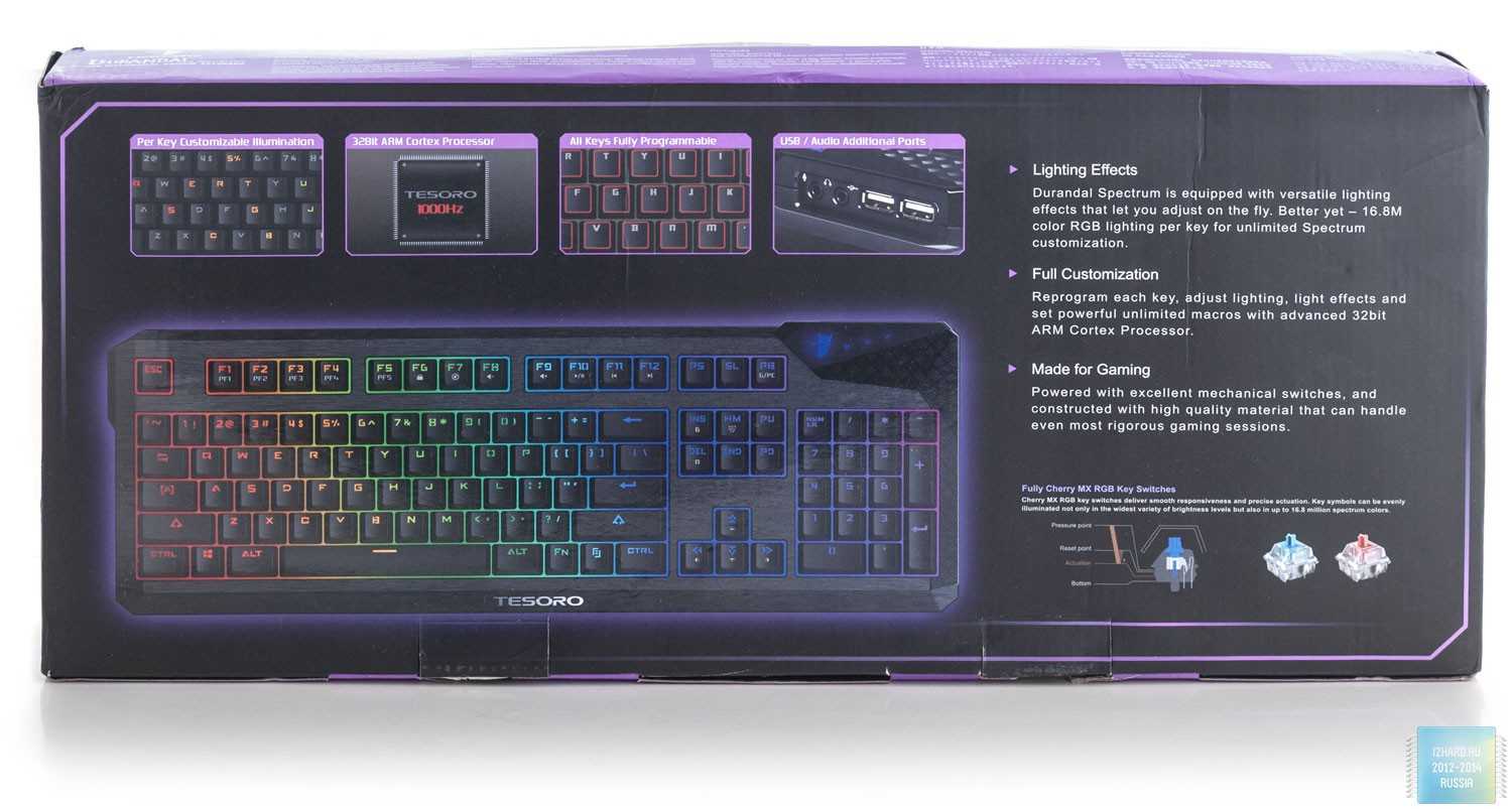 Клавиатура Tesoro Durandal Spectrum представлена намеханических переключателях Cherry MXRGB четырех видов— Red, Brown, Black иBlue.