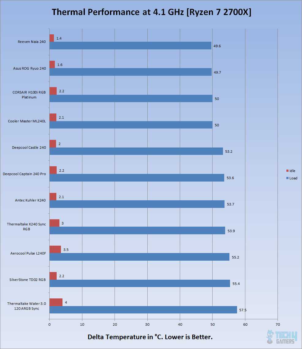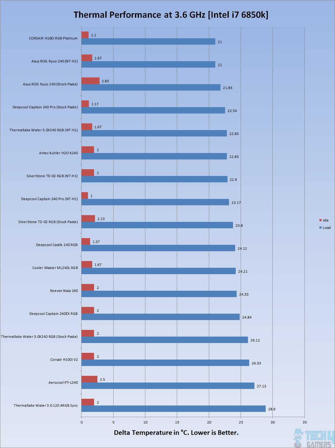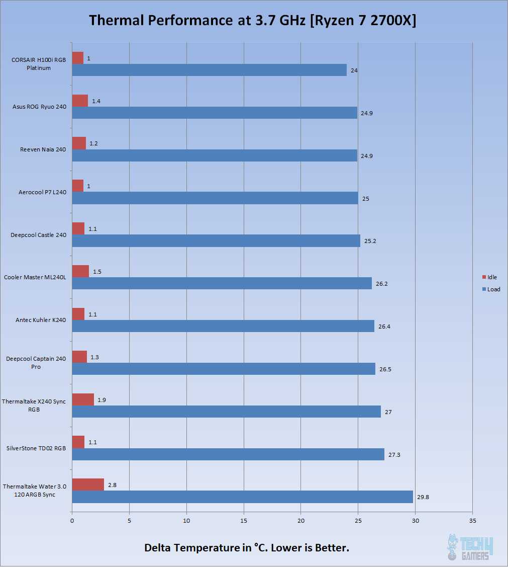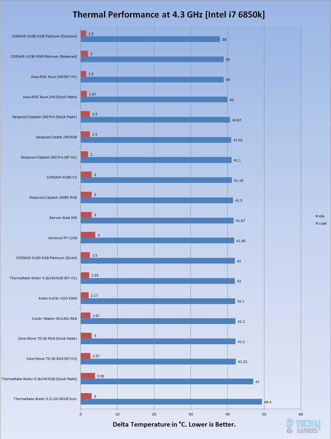 With just 0.4°C and 0.3°C difference, the CORSAIR H100i RGB PLATINUM CPU Liquid Cooler takes the third slot.