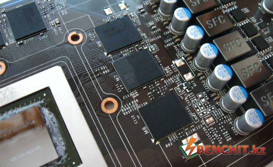 Вокруг процессоров расположено восемь микросхем памяти производства Samsung с маркировкой K4G20325FD-FC28, как и в случае с референсной GTX 770.