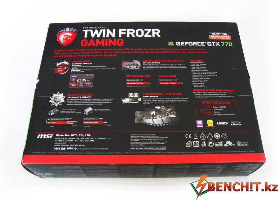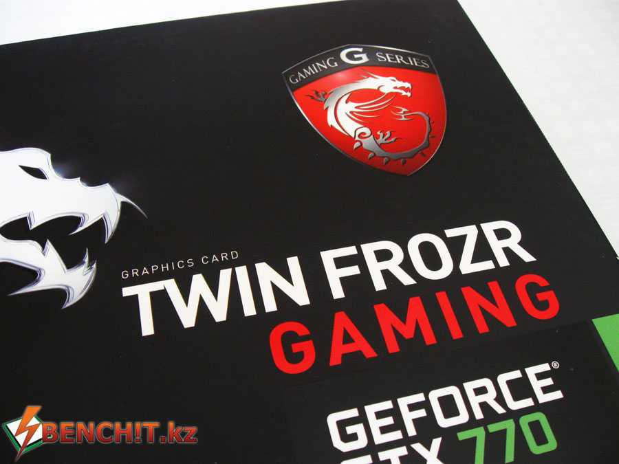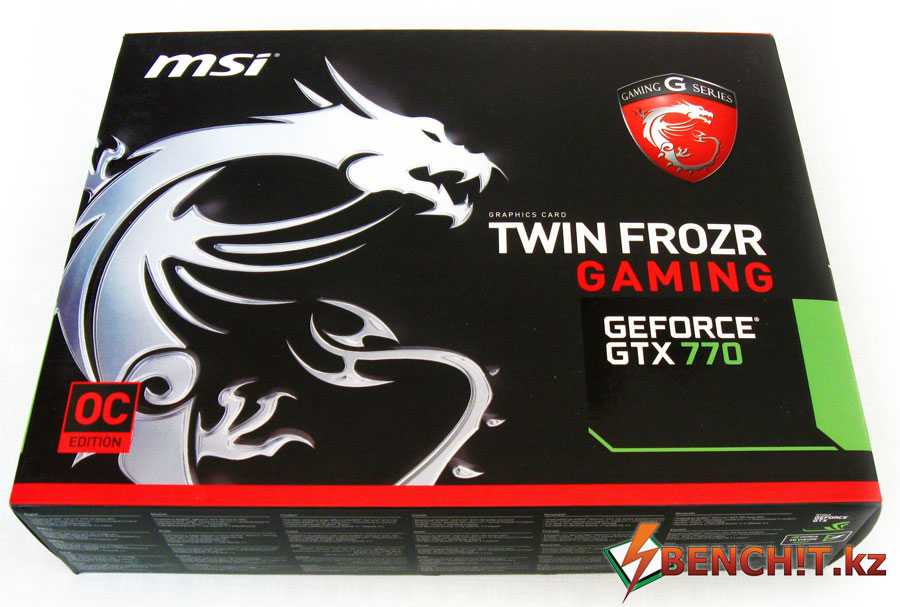 Упаковка MSI GTX 770 сохраняет тот же стиль оформления, что и упаковка материнской платы. Тут также присутствуют черно-красные тона, дракон, логотип Gaming Series.
