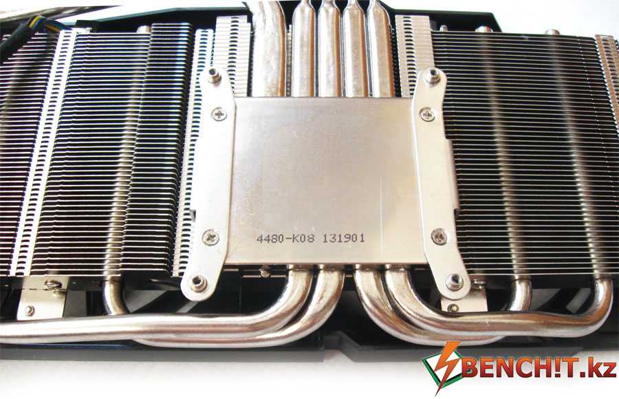Внутреннее устройство системы охлаждения уже знакомо нам по GTX TITAN и GTX 780. Графический процессор отдает тепло массивному радиатору с испарительной камерой в основании, а к микросхемам памяти и MOSFET’ам системы питания через термопрокладки прижата тяжелая рама, которая также придает конструкции необходимую жесткость.
