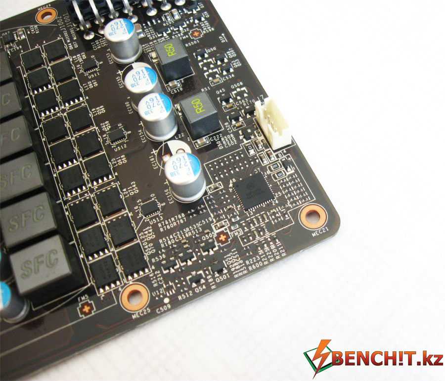 Система питания видеокарты в общей сложности имеет шесть фаз, две из которых отведены для питания видеопамяти. За контроль напряжения отвечает контроллер OnSemi NCP4206 – такой же, как и у референсных GTX 770. Как отмечалось ранее, для питания видеокарты потребуется два коннектора по 8 pin. В итоге, общая мощность, которую можно выделить видеокарте, составляет 375 Вт.