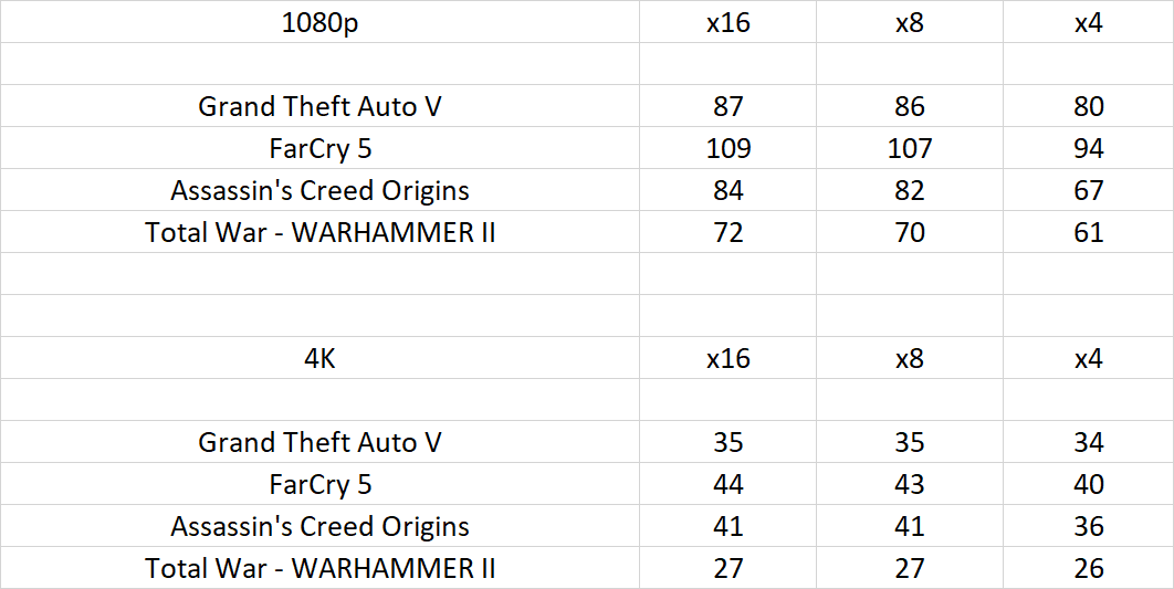 В играх ситуация не сильно поменялась, но разрыв уже заметен. Между режимами х16 и х8 разницы в производительности нет, а вот при переходе на х4 производительность снижается примерно на 10%