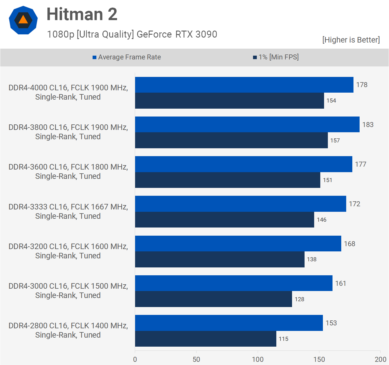 В Hitman 2 можно получить довольно постоянное масштабирование. Пропускная способность и/или задержки памяти улучшаются до DDR4-3800. Если заставить работать FCLK на частоте 2000 МГц, можно было бы получить ещё 3% производительности до конфигурации DDR4-4000.