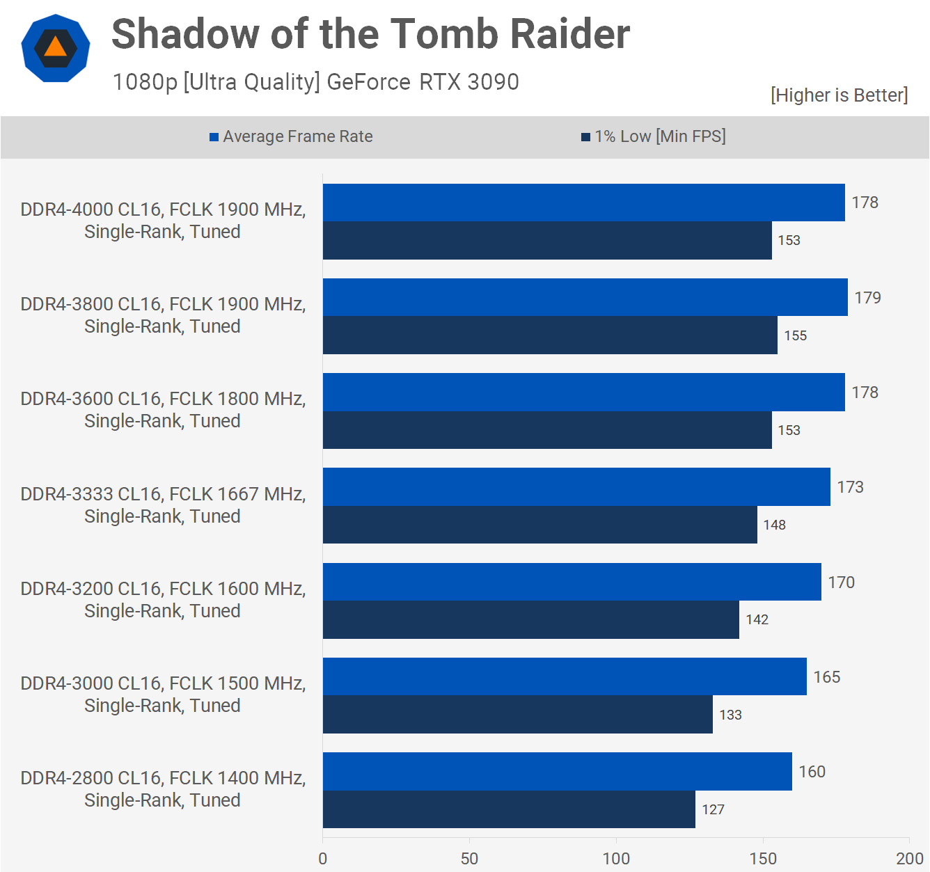 Игра Shadow of The Tomb Raider напоминает другие требовательные игры и здесь лучшим выбором является DDR4-3600, как и на архитектуре Zen 2. Если вы хотите больше производительности без переплаты за память, DDR4-3600 CL16 подходит лучше всего.