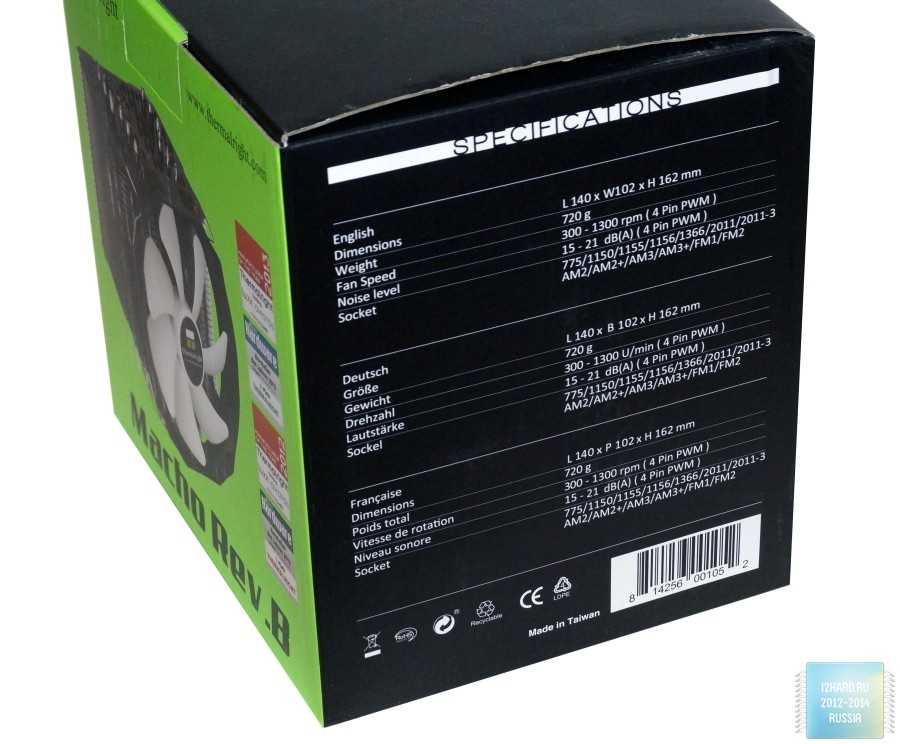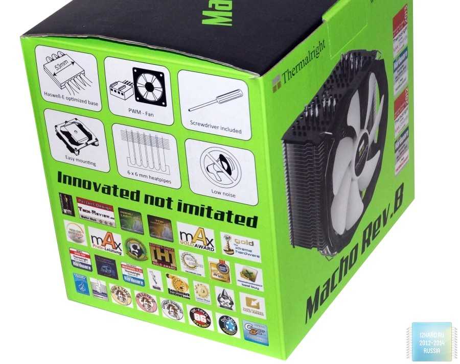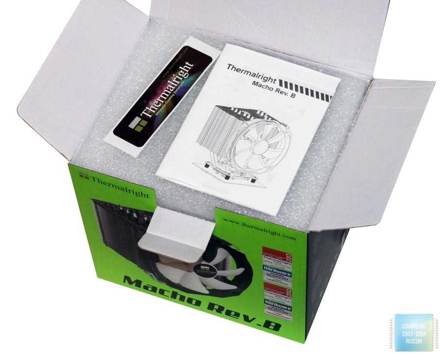Упаковка Macho Rev.B, вотличие от ранее рассмотренного Archon IB-E X2, более красочная и информативная. Тут присутствуют присвоенные редакциями награды, отданные этому кулеру. Указаны некоторыеособенности модели иперечислены технические характеристики.
