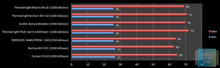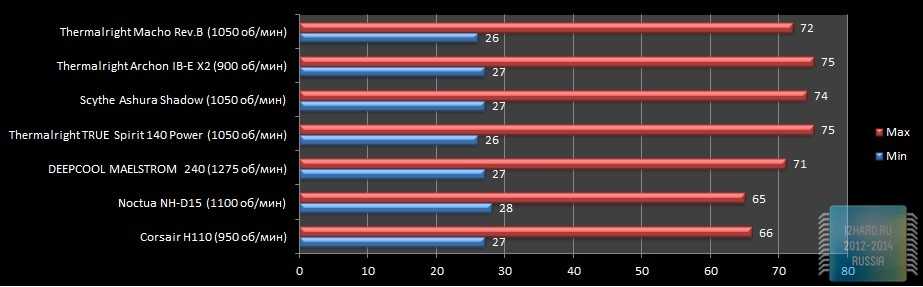 Тестирование проводилось в вышеуказанной конфигурации, а в качестве термоинтерфейса была использована термопастаArctic Cooling MX4. Скорость вращения лопастей у всех корпусных вентиляторов была установленана возможный максимум, комнатная температура на момент тестирования составляла 23-24°C. С каждой новой статьей о системах охлаждения сравнительная таблица пополняется новымиданными, что делает её изучение более интересным.Почти все представленные в сравнении системы охлаждения тестировались в состоянии «из коробки», лишь в случае сCorsair H110 были использованы некомплектныевентиляторы(Noctua NF-A14 FLX).Раздел «тестирование» делится надва подхода.Первый подход заключается в выяснении максимальных возможностей тестируемых экземпляров, при этом на создаваемый системами охлаждения шум внимания не обращается. Второй подход заключается в поиске наиболее комфортных шумовых характеристик тестируемых экземпляров с последующим повторением нагрузки и замером максимальных температур ядер процессора. На графиках, которые представлены ниже, указаны минимальные/максимальные температуры (°C)ядер процессора в простое/нагрузке.