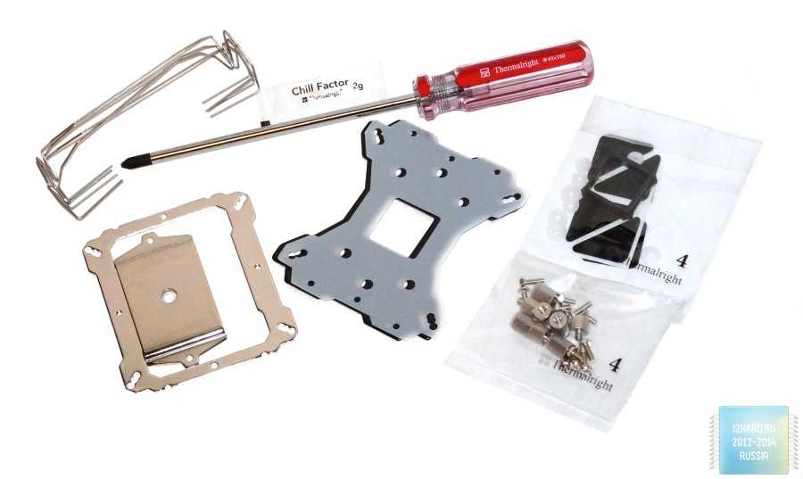 Остальная комплектация находится в отдельной коробочке, мелочёвка расфасована по пакетикам. Комплектация включает в себя: набор для установки кулера наAMD платформы (AM2, AM2+, AM3, AM3+, FM1, FM2), набор для установки наIntel платформы (775, 1150, 1155, 1156, 1366, 2011, 2011-3), 4 скобы для крепления вентиляторов, пакетик с фирменным термоинтерфейсом Chill Factor, 4 клейкие антивибрационные прокладкиисамое главное -отвертка. Первые модификации этого кулера поставлялисьбез отвертки (комплектовались маленьким ключом), что существенно затрудняло монтаж радиатора на материнскую плату.