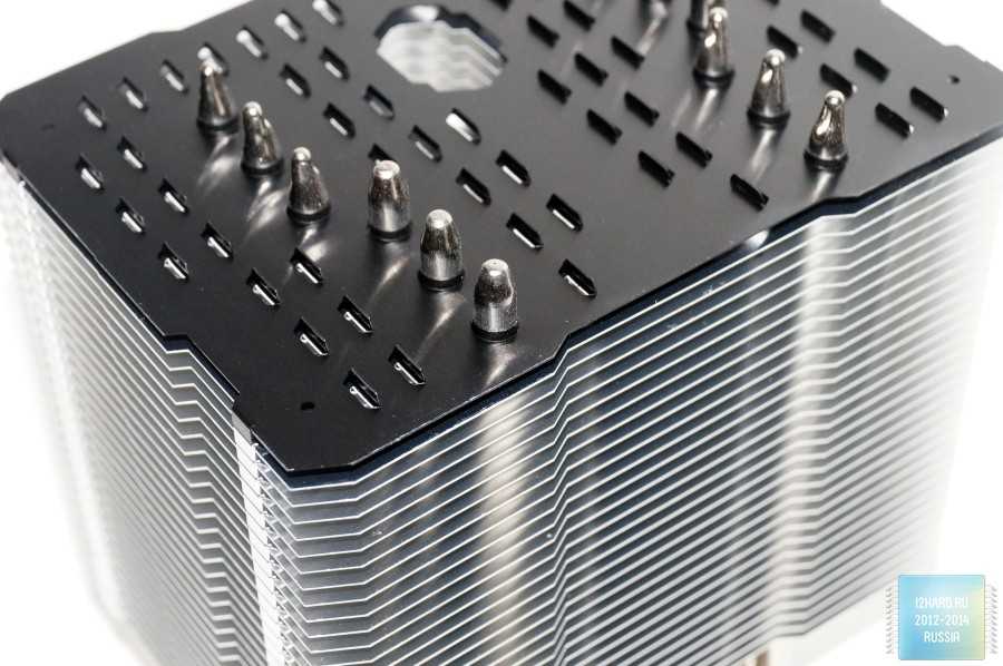 Шестимиллиметровые тепловые трубки пронизывают 31 алюминиевуюпластину. Расстояние между пластинами довольно широкое и составляет ~3мм. Большое расстояние между пластинами сделано не просто так — расчет на работу с вентиляторами с низкими показателями воздушного давления и скорости вращения лопастей.При таком расстоянии подобные вентиляторы смогут наилучшим образом продувать конструкцию.