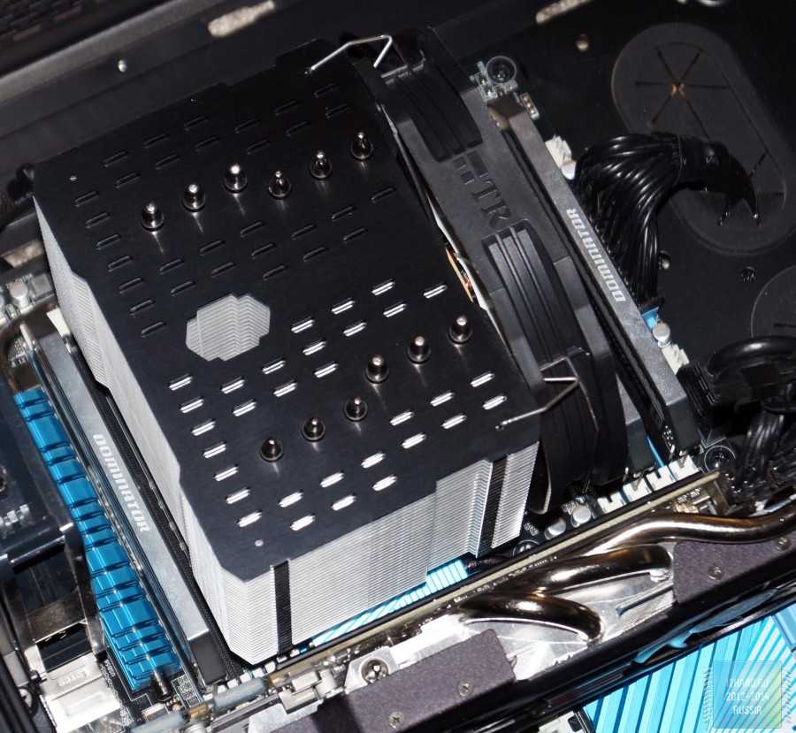 Стоит отметить, что радиатор не создает никаких помех верхнему разъему PCI-e. Если ставить второй вентилятор на радиатор, то он будет нависать над крайним левым разъемом памяти и, таким образом, будут перекрыты все разъемы левой стороны. Также стоит отметить, что воздушный поток создаваемый вторым вентилятором может создать проблемы вентилятору установленному на задней стенке корпуса (расположены слишком близко и на разном уровне).