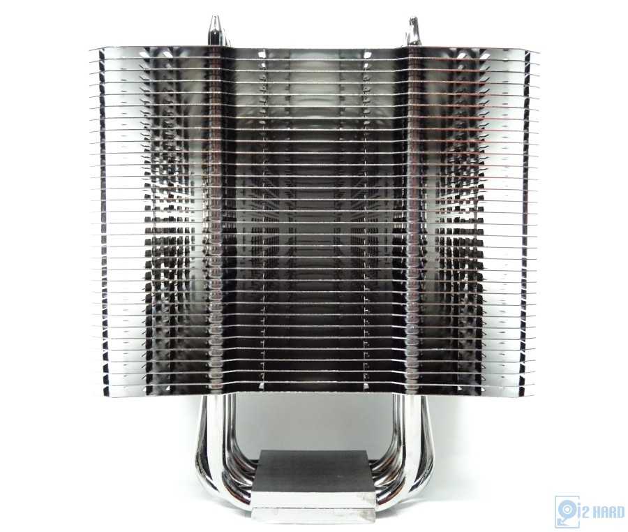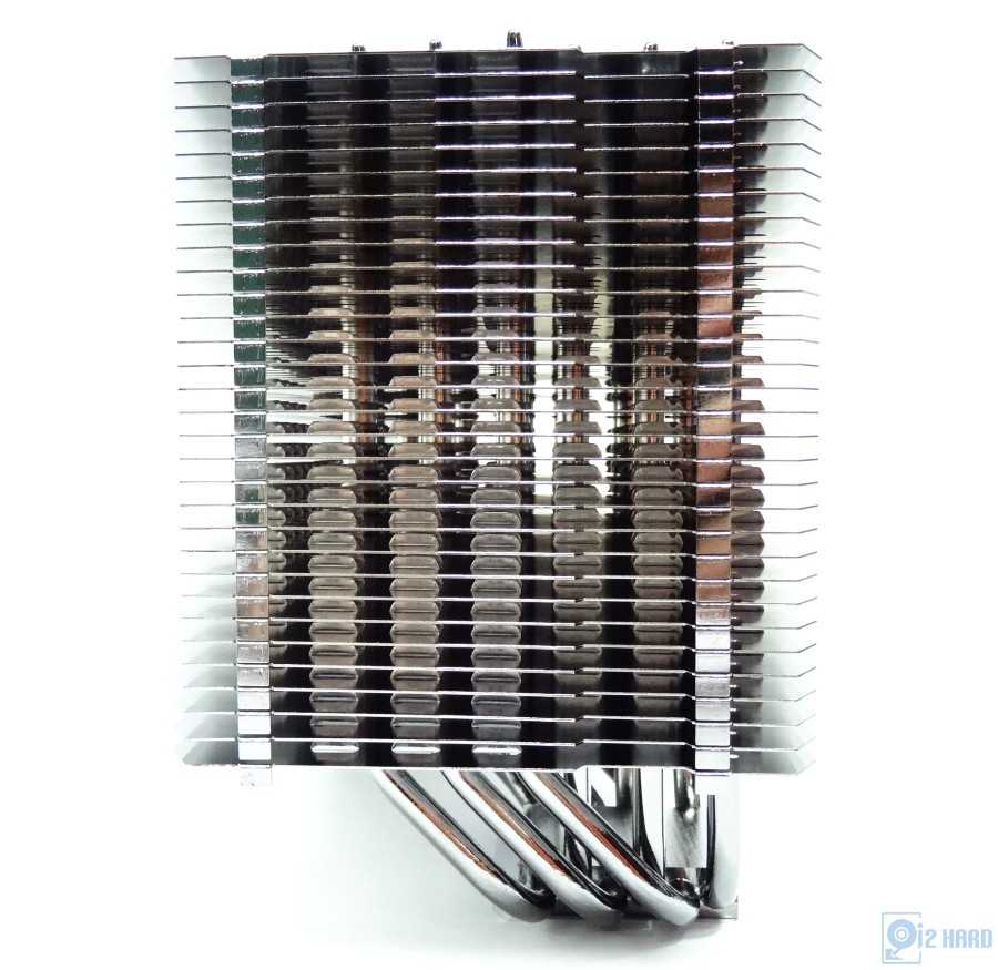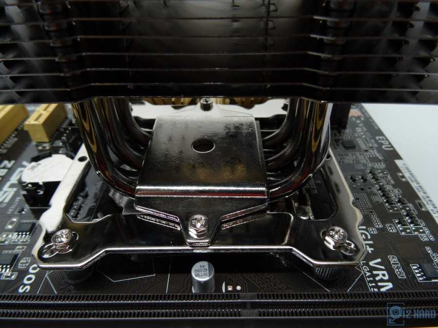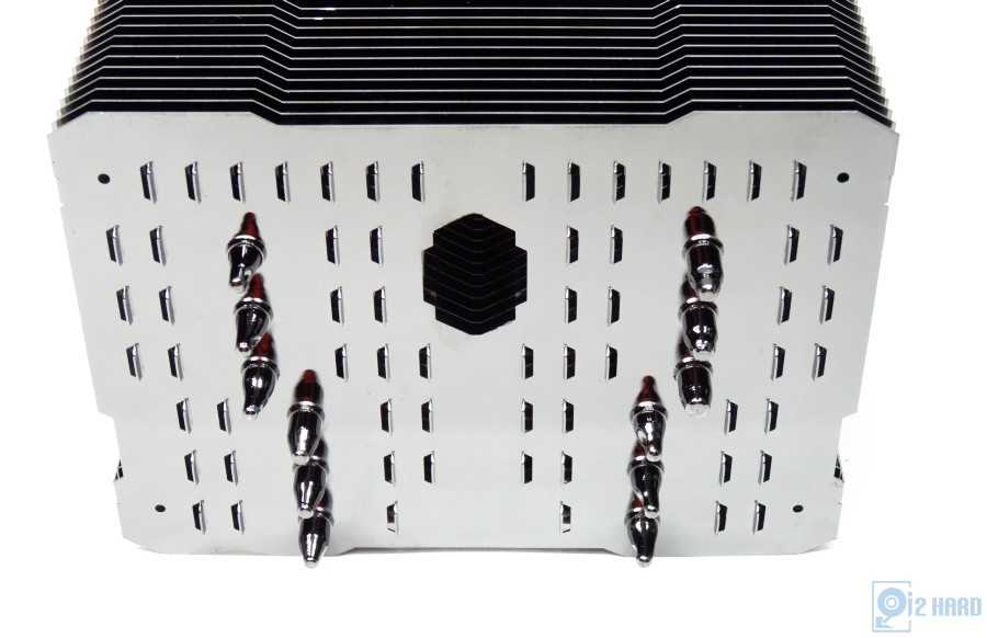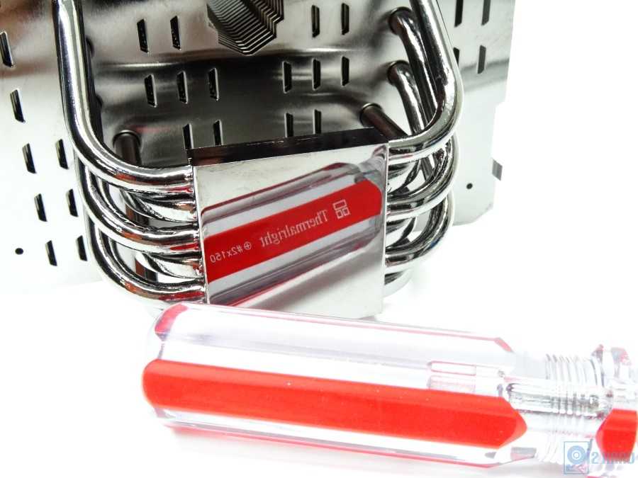 На шесть тепловых трубок диаметров 6 мм нанизана 31 алюминиевая пластина толщиной 0,4 мм методом опрессовки. Сами пластины по всей площади имеют многочисленные прорези для улучшения эффективности охлаждения за счет положительного влияния воздушного потока. Также почти по центру пластины имеют большой вырез, через который с помощью отвертки производится фиксация прижимной пластины к креплениям на материнской плате. Это и есть то самый инженерный шаг, который требует в обязательном порядке применения отвертки при монтаже этого кулера. И как следствие эту самую отвертку в комплекте.