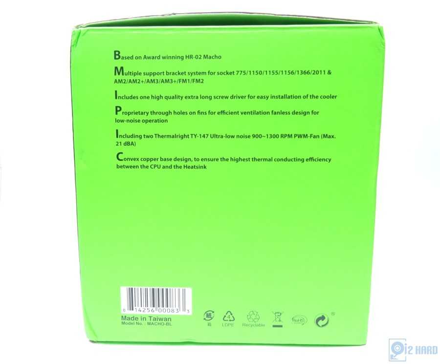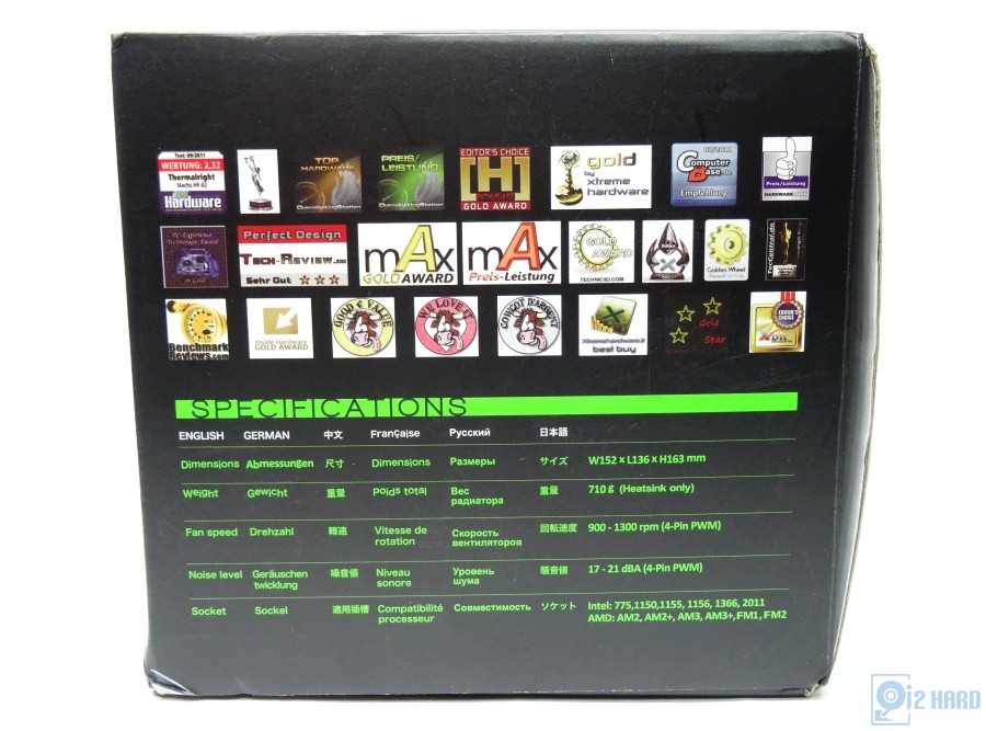 Технические характеристики Macho Black представлены на шести языках, включая русский. Несмотря на массивные габариты кулера стоит отметить небольшую массу радиатора в 710 грамм (без вентиляторов). Еще до старта продаж Macho Black получил множество наград от ведущих мировых интернет-изданий, о чем компания Thermalright не смогла умолчать и разместила все полученные кулером награды на его упаковке.