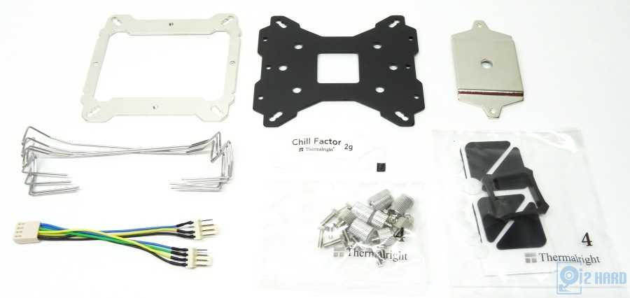 Большая часть аксессуаров кулера представляет собой крепления для монтажа радиатора на материнские платы с различными разъемами. Поддерживается установка на материнские платы на платформах Intel LGA775/1150/1155/1156/1366/2011, а также на платформах AMD Socket AM2/AM2+/AM3/AM3+/FM1/FM2. В комплекте идут четыре металлические скобы для крепления вентиляторов, а также восемь клеящихся поролоновых накладки в местах соприкосновения вентиляторов и радиатора для уменьшения вибрации. Не забыл производитель укомплектовать свой продукт и фирменной термопастой Chill Factor собственного производства — в комплекте есть небольшой пакетик массой в 2 грамма. Переходник питания вентиляторов с 2*4pin > 1*4pin призван объединить оба вентилятора в одну цепь и управлять их оборотами одновременно.