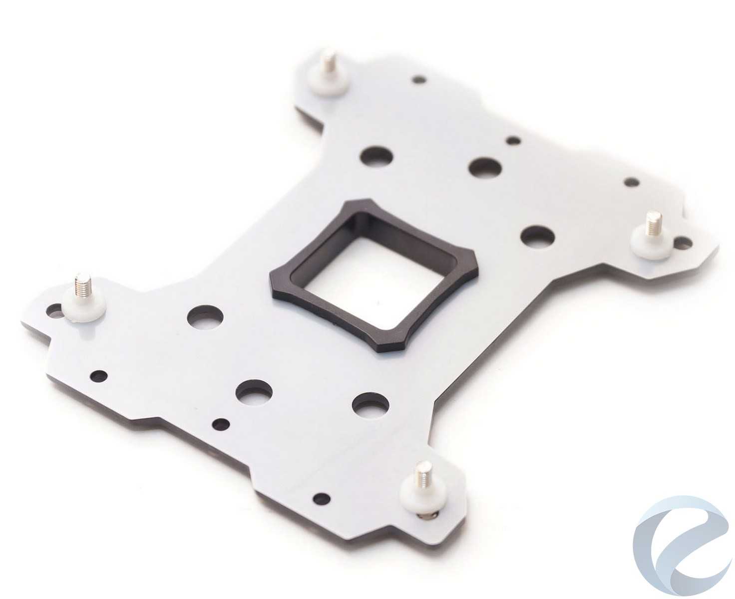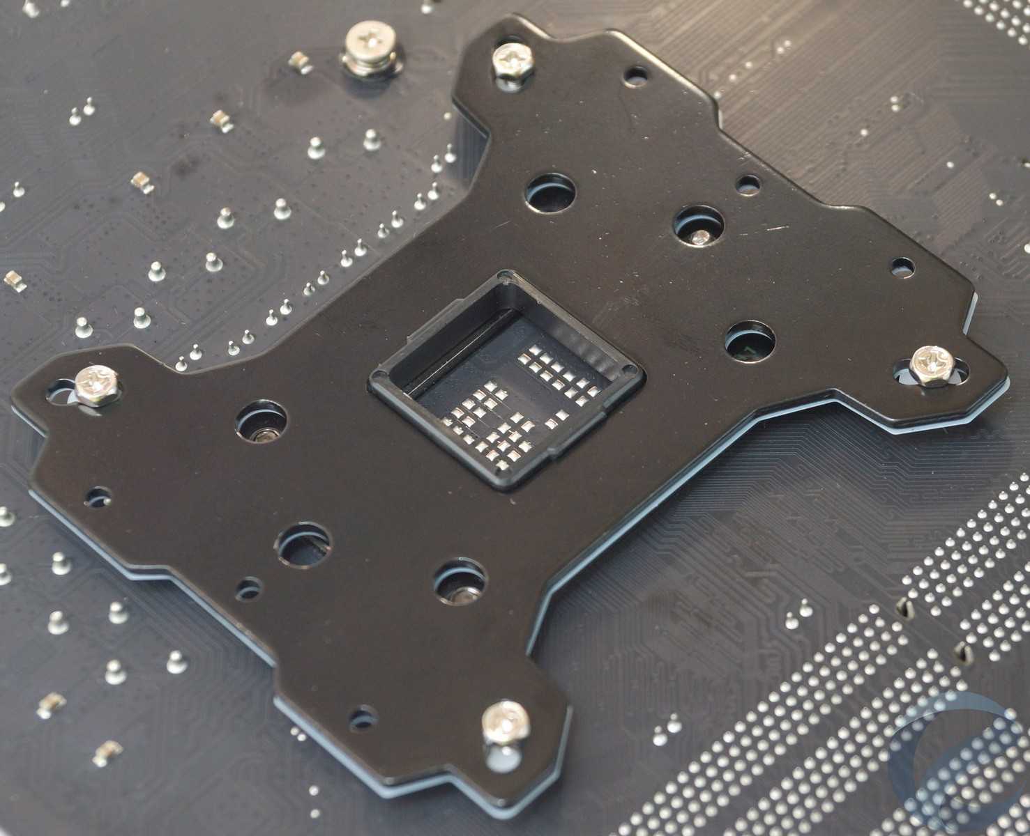 В инструкции пользователя есть подробная иллюстрация демонстрирующая порядок сборки, все детали пронумерованы. Первым делом вставляем в опорную пластину винты и фиксируем их пластиковыми шайбами. Не забываем поместить между пластиной и текстолитом материнской платы изолирующую подложку и вставить специальную пластиковую рамку.