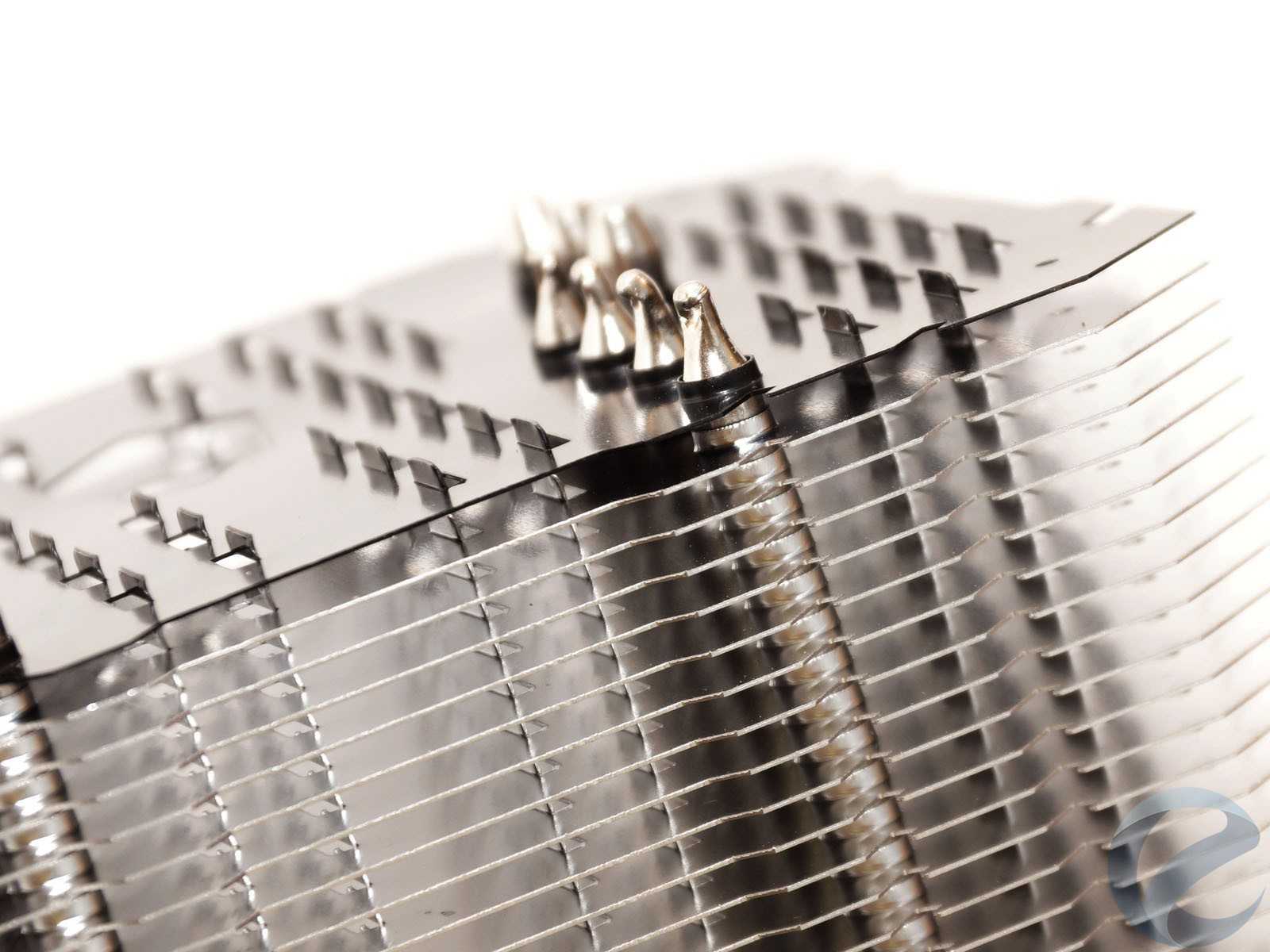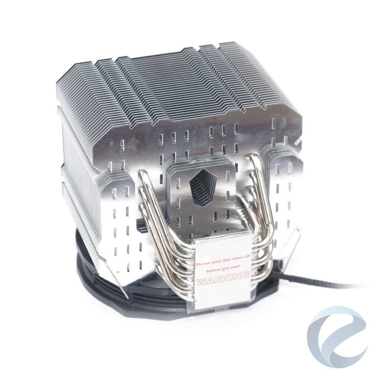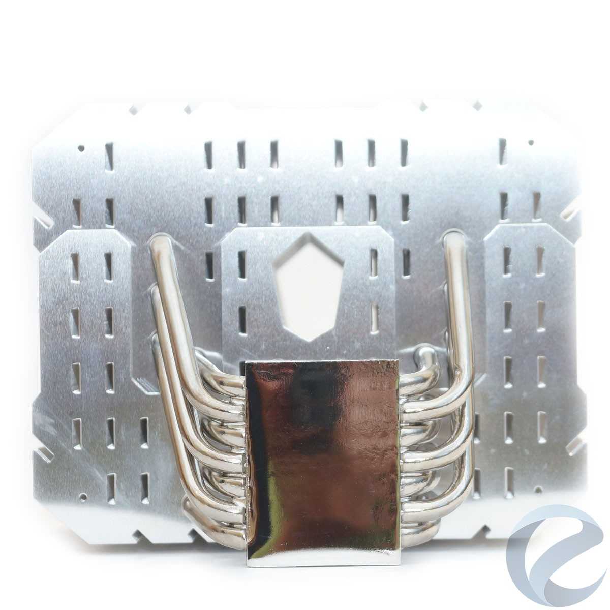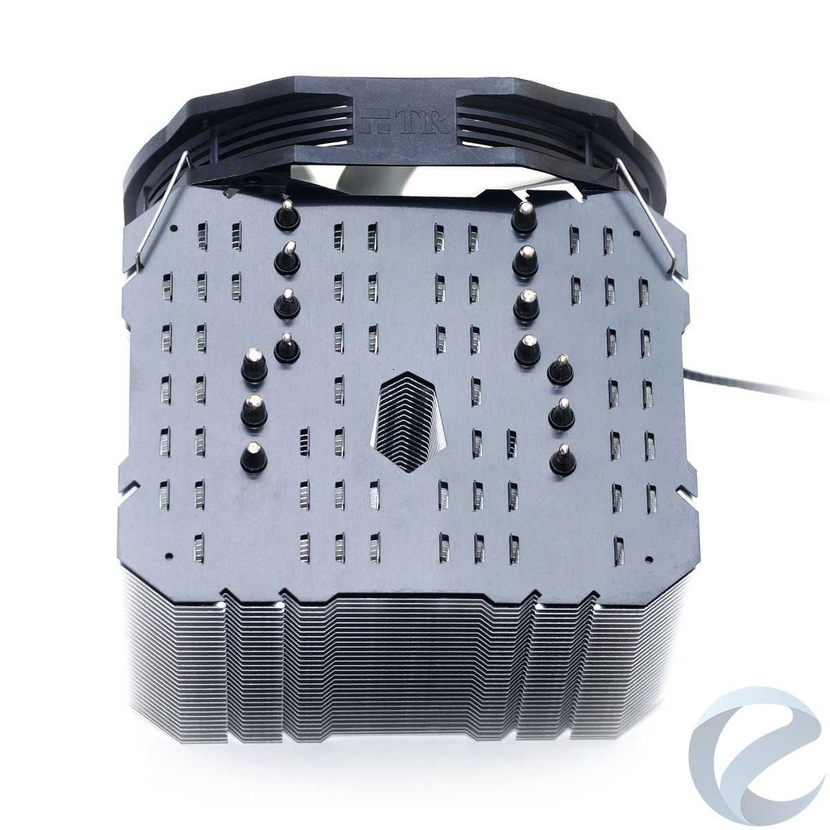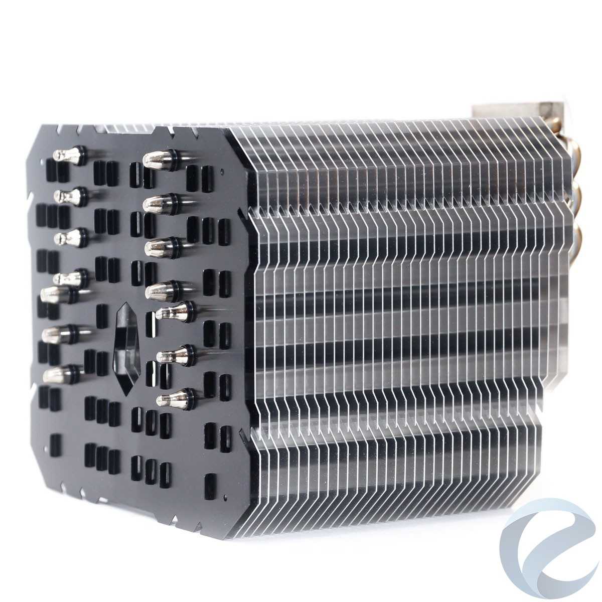 Состоит радиатор из семи тепловых трубок диаметром 6 мм с никелированным покрытием. Тридцать пять алюминиевых пластин толщиной 0.4 мм нанизаны на трубки с расстоянием в 3.1 мм. Три нижних пластины меньшего размера, через них проходят не все трубки. Общая площадь рассеивания составляет 12000 см2, для односекционной системы это большой показатель. Верхняя пластина сделана матово-черной, что добавляет радиатору эстетики в корпусе с окном на боковой крышке.