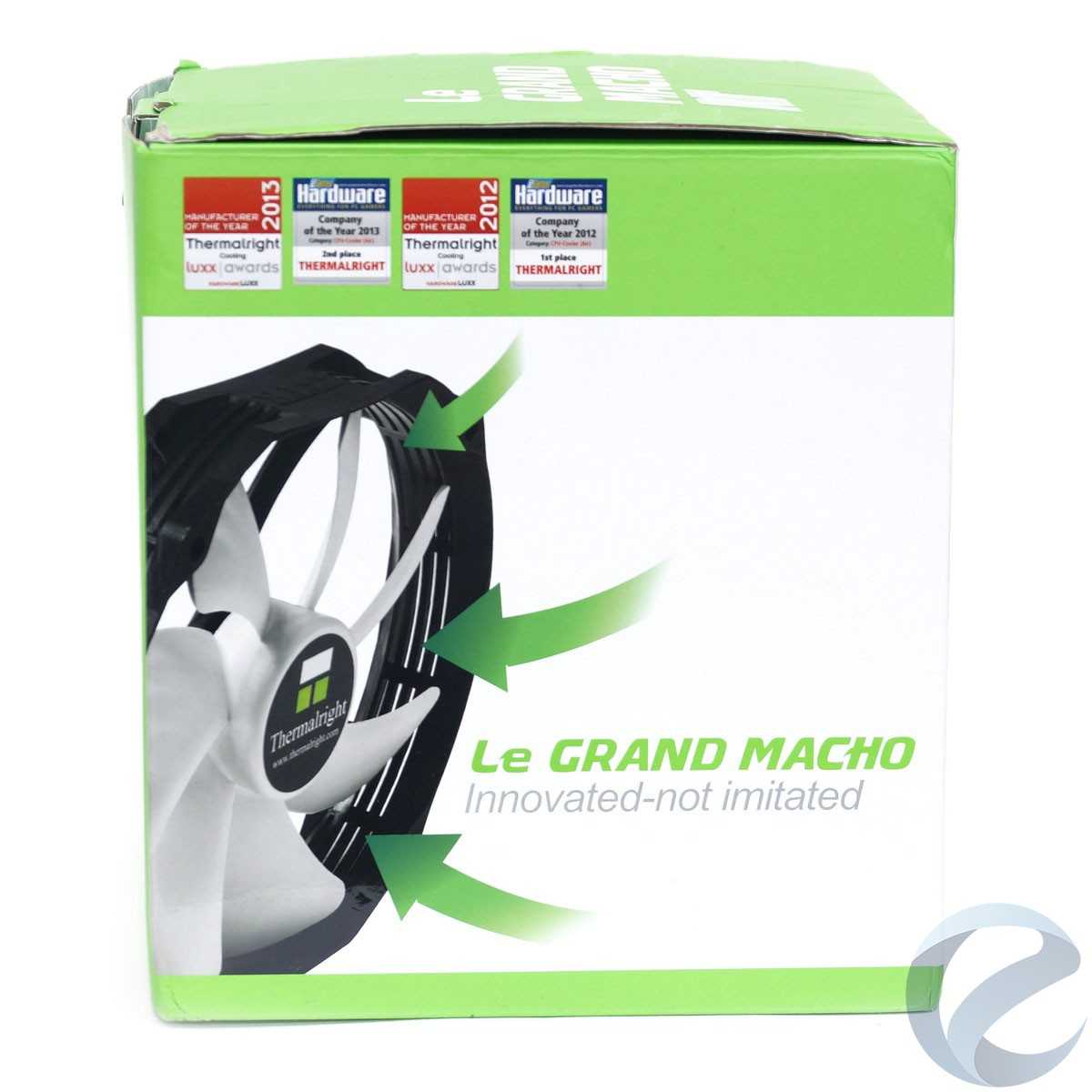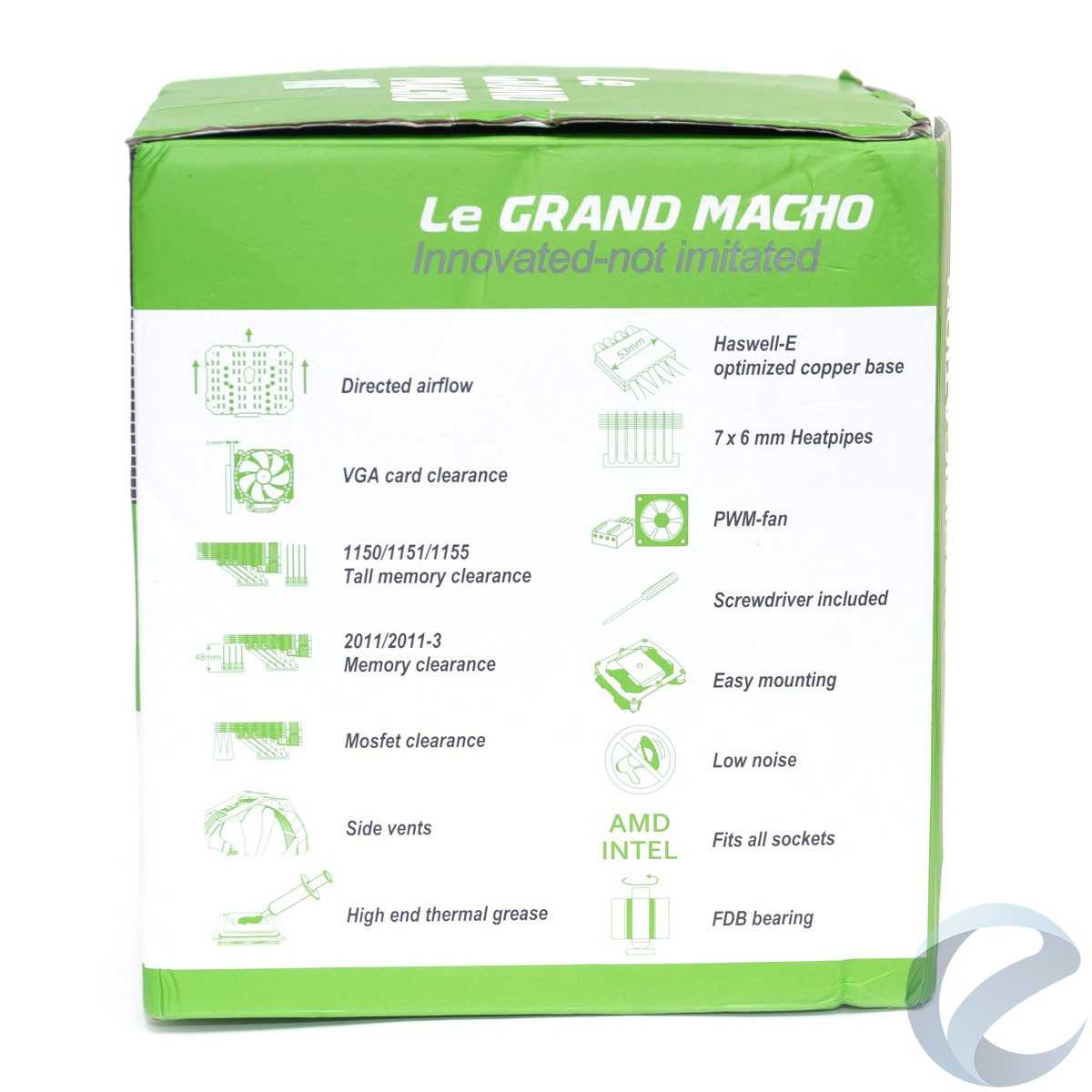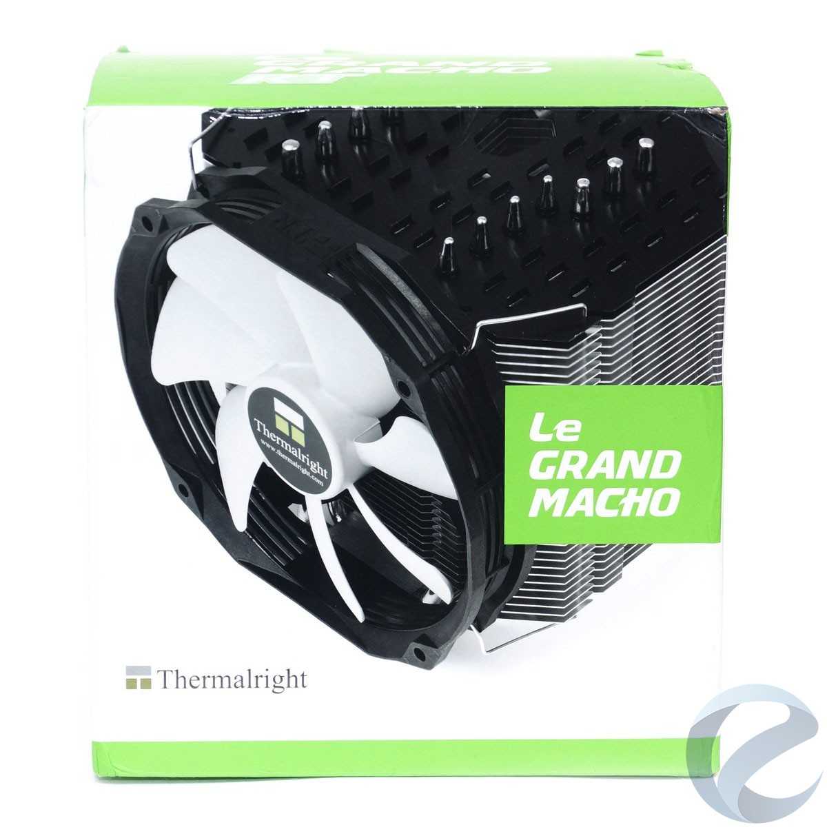 Кулер Le Grand Macho RT поставляется в большой кубической коробке, при таком размере ей пригодились бы ручки для транспортировки. Упаковка оформлена в белом и зеленом цветах, смотрится ярко. На лицевой стороне фотография кулера с закрепленным вентилятором, причем акцент именно на последнем, фотография не позволяет оценить форму самого кулера. На обратной стороне коробки таблица с техническими характеристиками.