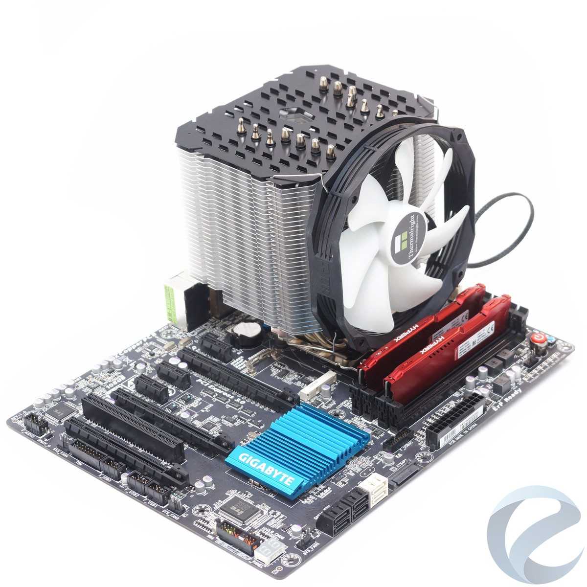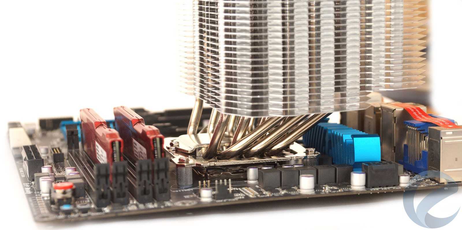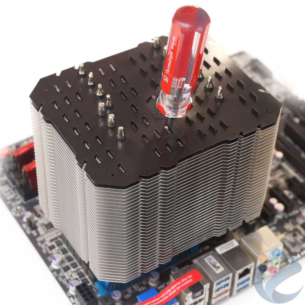 Перед нами — просто огромный радиатор, несомненно, способный работать в пассивном режиме. Несмотря на его размеры, он спокойно уместится практически на любой материнской плате, не перекрывая верхние слоты PCI-e и слоты памяти.