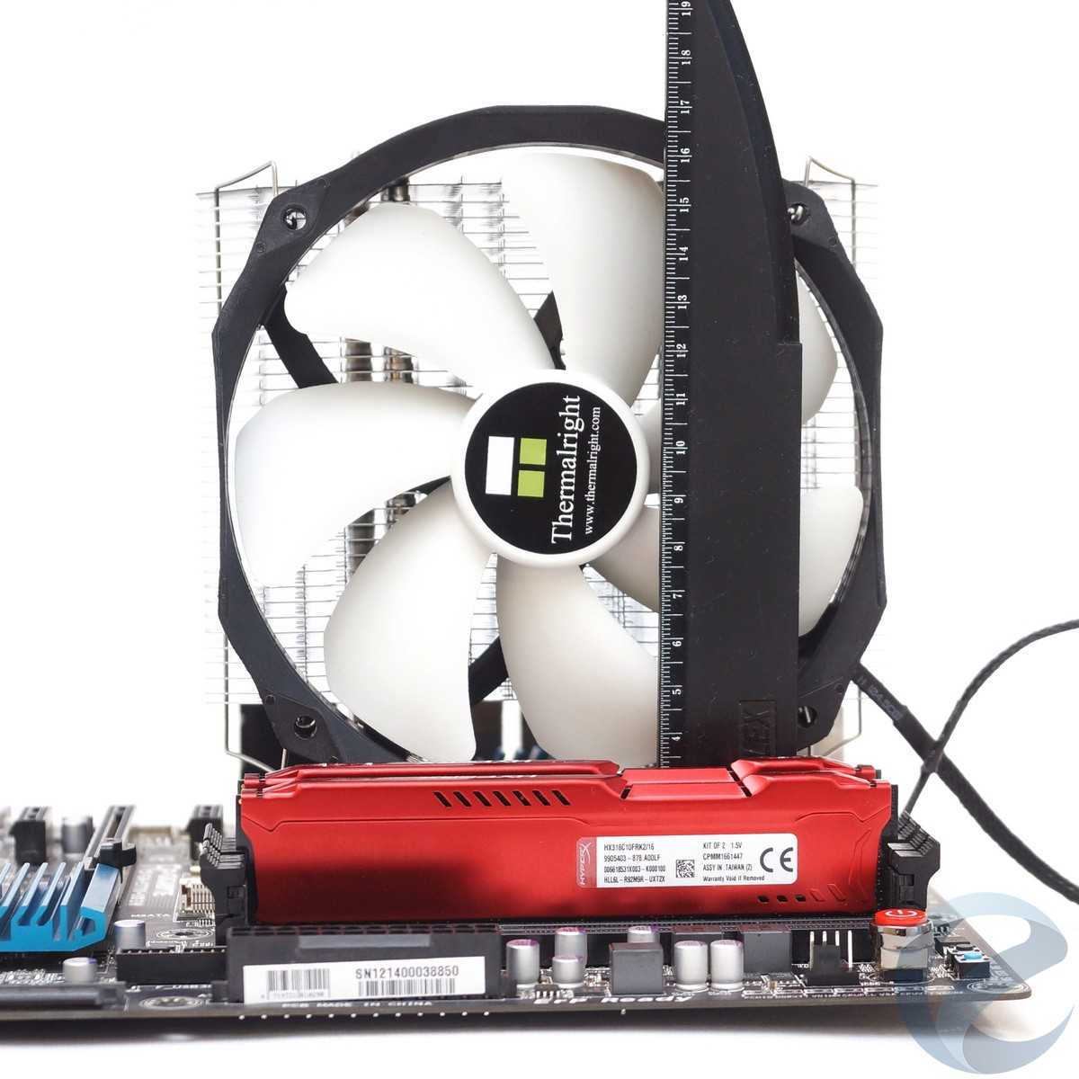 Если вентилятор развернуть в «нестандартное» положение, то высота системы охлаждения получится 170 мм. Это может понадобиться при установке на некоторые модели материнских плат с близко рассположенным слотом PCI-E к процессорному сокету. Эти нюансы стоит учитывать при подборе комплектующих.