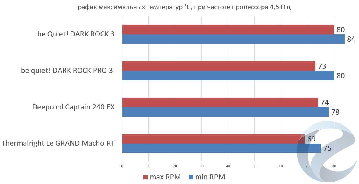 Если при стоковых частотах процессора мы наблюдаем практически паритет между Le GRAND Macho RT, СЖО и двухсекционным кулером. Разница температур укладывается в погрешность измерения. Им уступает только относительно не крупный кулер be Quiet! DARK ROCK 3. А вот с разогнанным процессором наш испытуемый справляется лучше: разница в 3-5 градусов.