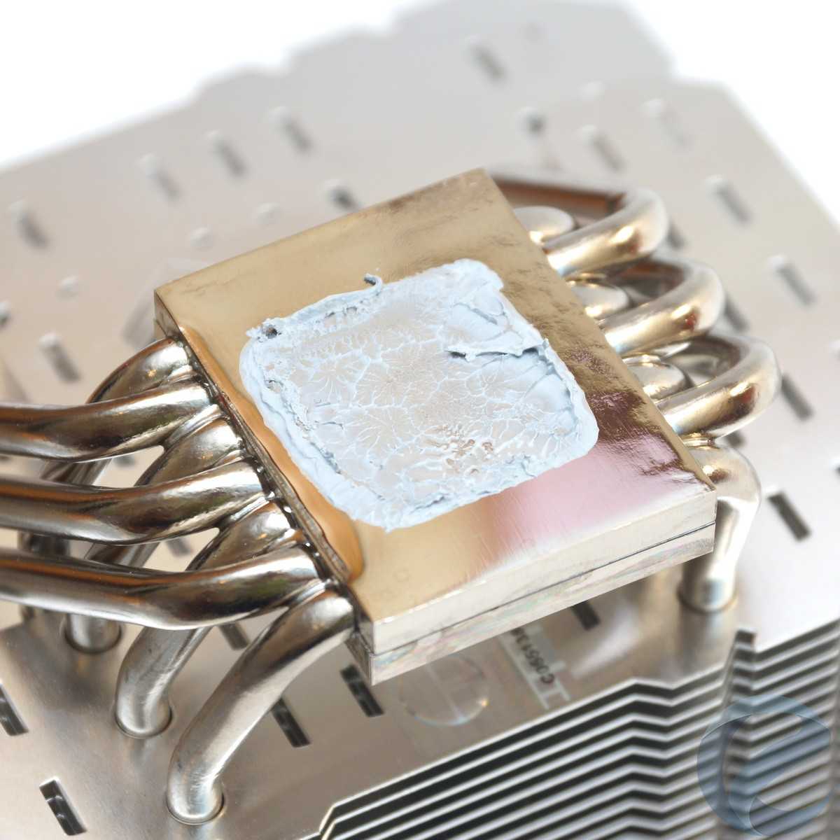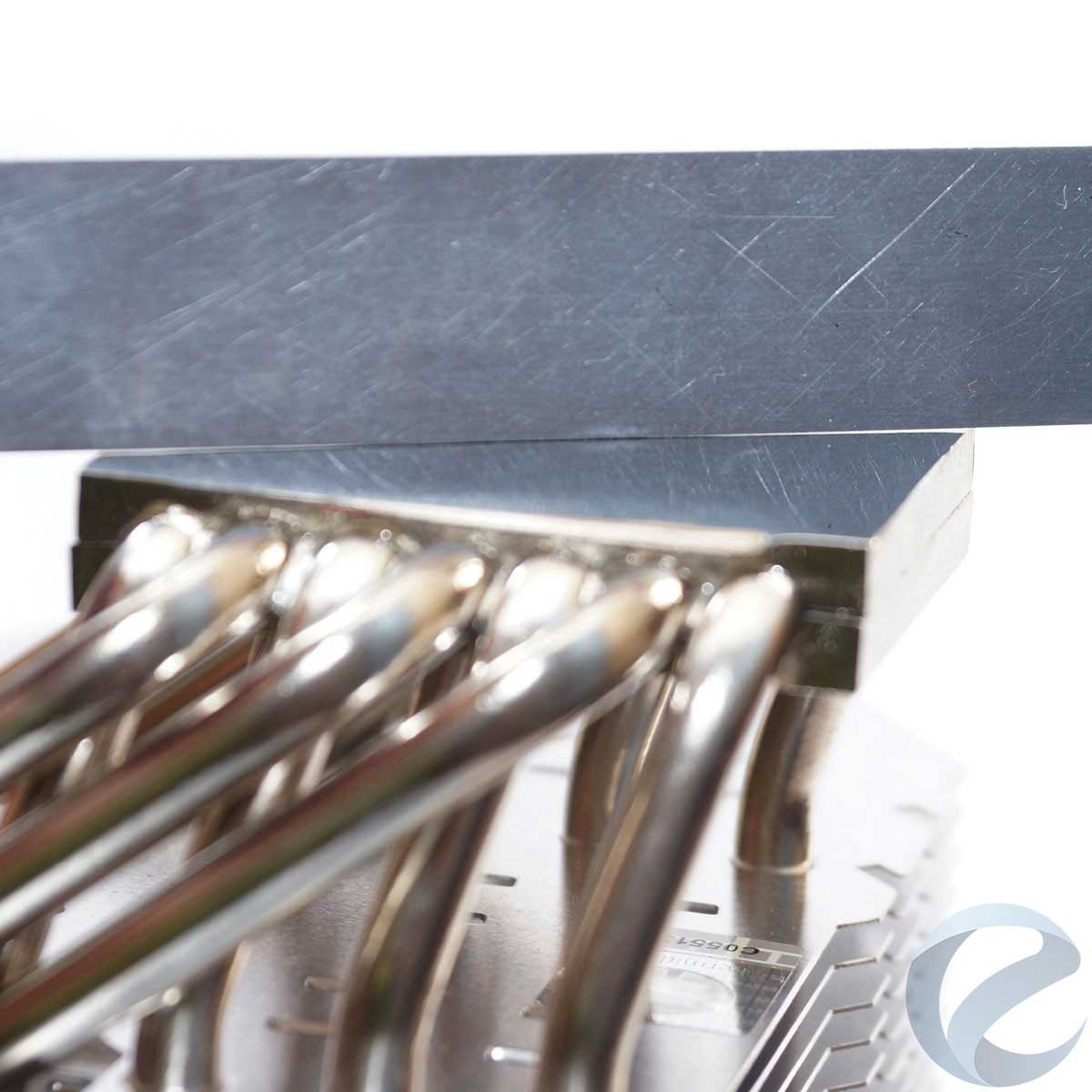 Основание сделано из двух медных пластин, между которых проходят тепловые трубки. Следы припоя свидетельствуют о пайке между трубками и пластинами. Основание никелировано и отполировано до зеркального блеска. У подошвы, традиционно для Thermalright, есть небольшая горбинка.