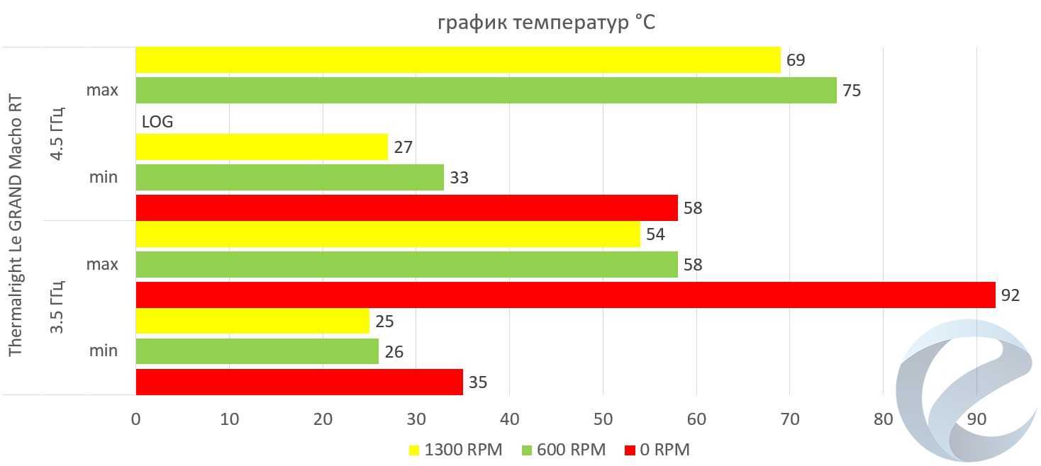 В пассивном режиме, без участия корпусных вентиляторов Le GRAND Macho RT с трудом справляется с охлаждением процессора при максимальной нагрузке, а разогнанный процессор перегревается в первые же минуты теста.