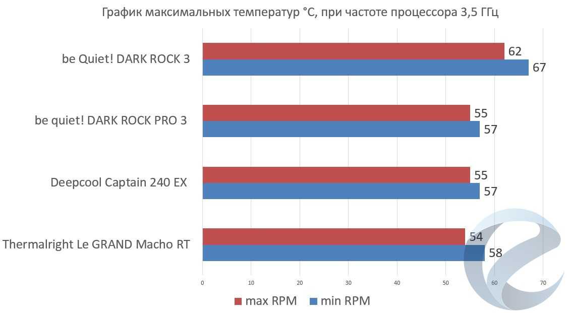 На этом же стенде ранее были протестированы: двухбашенный суперкулер be quiet! DARK ROCK PRO 3 с двумя комплектными вентиляторами, его более простой собрат be Quiet! DARK ROCK 3, а также СЖО Deepcool CAPTAIN 240 EX.