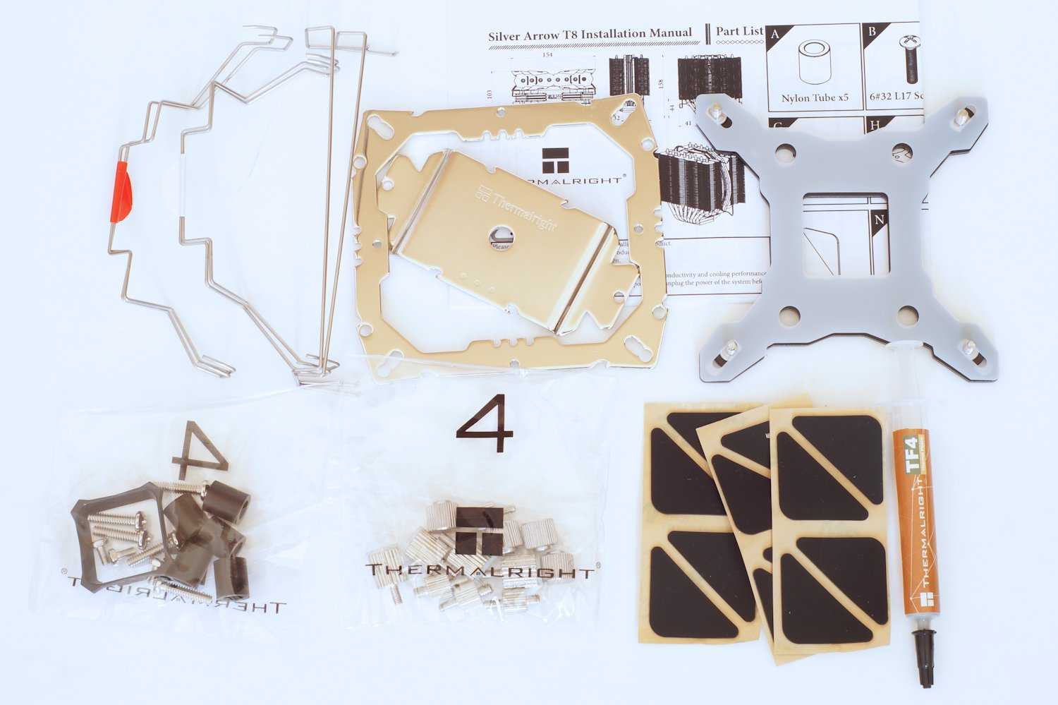Комплектация у кулера солидная. В нее входят комплекты креплений для платформ AMD/Intel, универсальный бекплейт, инструкция, три комплекта скоб для установки вентиляторов, три комплекта демпферных накладок под вентиляторы и современная термопаста Thermalright TF4.