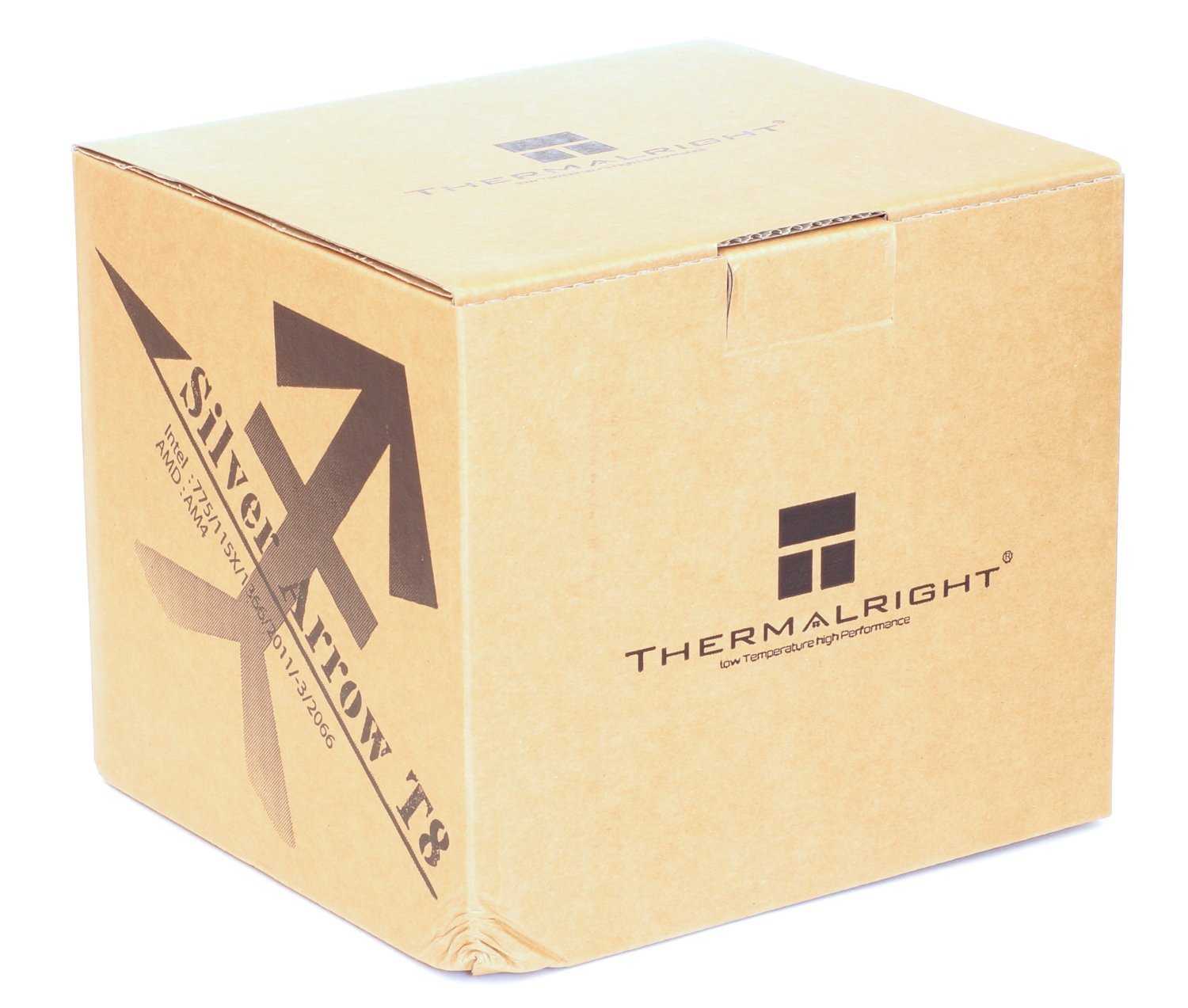 Как и раньше, «топовые» кулеры компании Thermalright поставляются в картонной коробке без красочного оформления, что является фирменной чертой. Вместе с тем на коробке указано название кулера Thermalright Silver Arrow T8, совместимость с сокетам Intel LGA775/115x/1366/2011(-3)/2066 иAMD AM4, а также технические характеристики. Неброско и понятно.