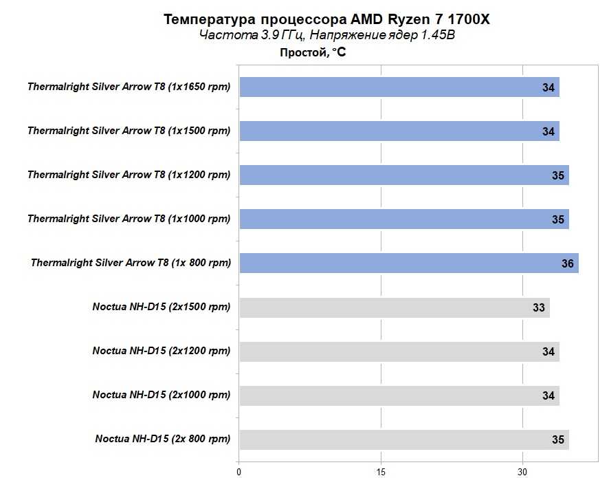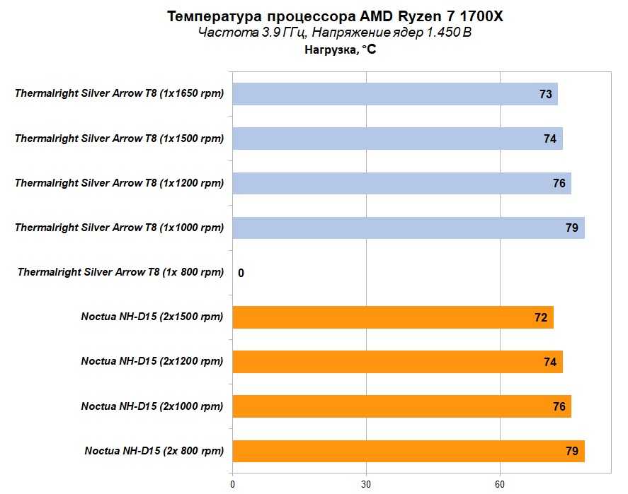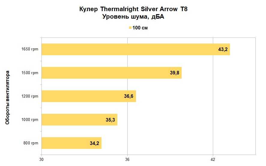 Учитывая конфигурацию кулера Thermalright Silver Arrow T8, когда в комплекте идет только один вентилятор, то результаты приятно радуют. Отставание кулера от эталона Noctua (с двумя вентиляторами) при максимальных оборотах составляет 1 °С (при одинаковых оборотах вентиляторов 2-3 °С). Хотя тут стоит напомнить, что основание у «серебряной стрелы» не самое лучше. Это же (и отсутствие второго вентилятора) не позволило кулеру обеспечить стабильность системы при минимальных оборотах 800 rpm (было превышение 81 °С и система зависала).