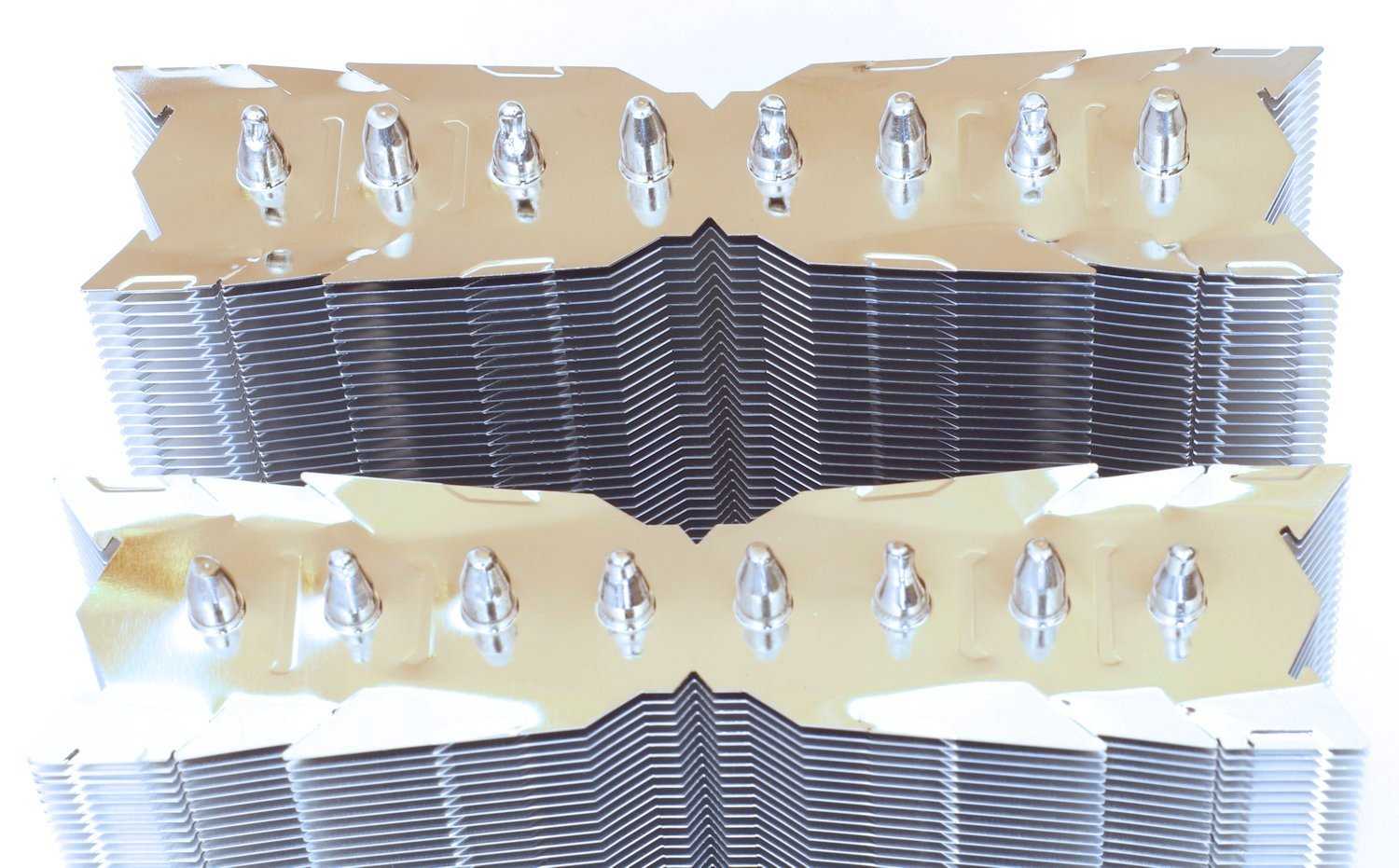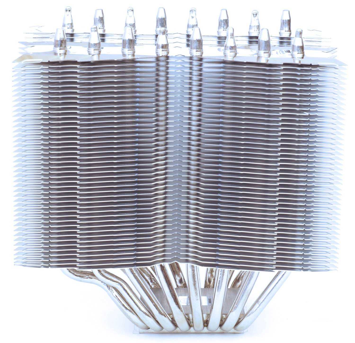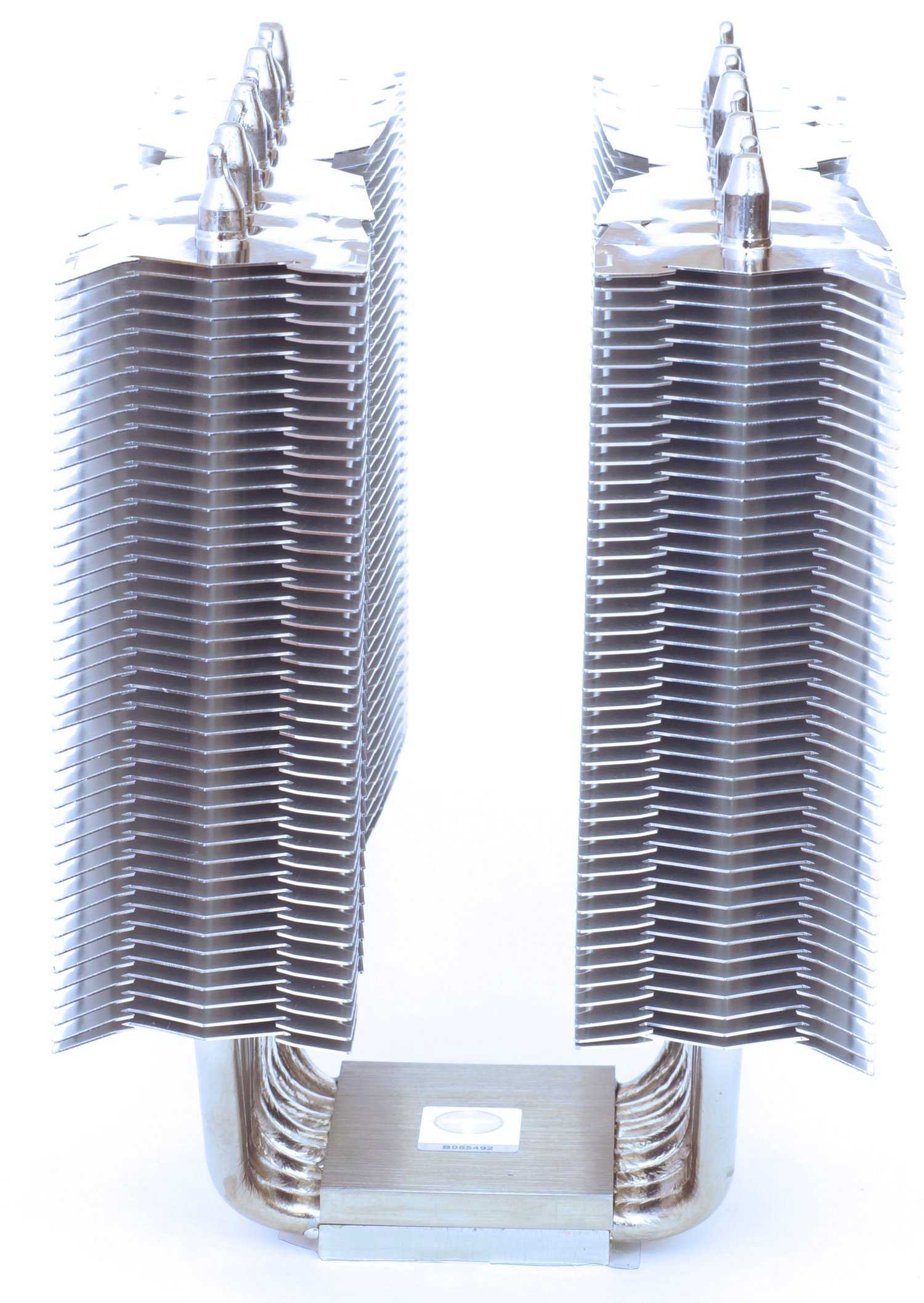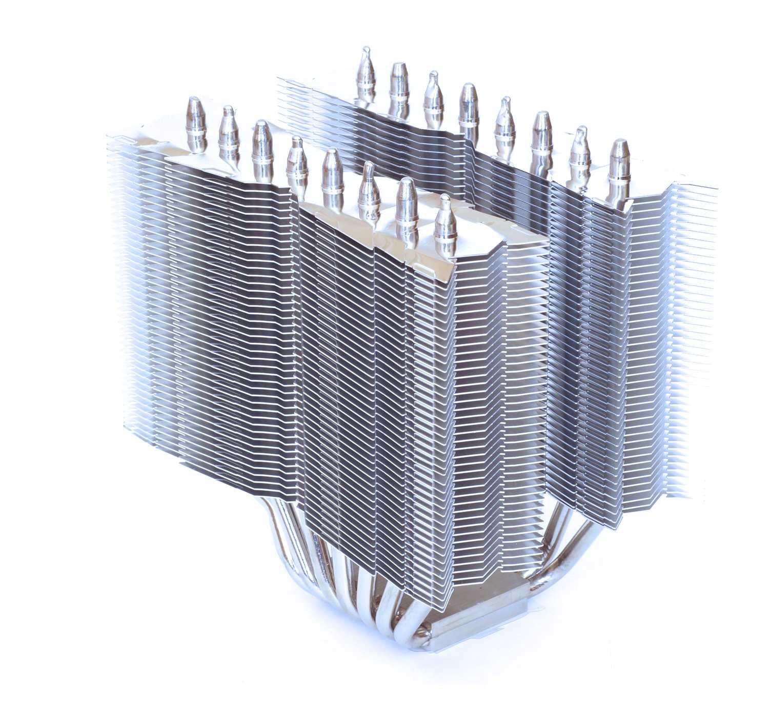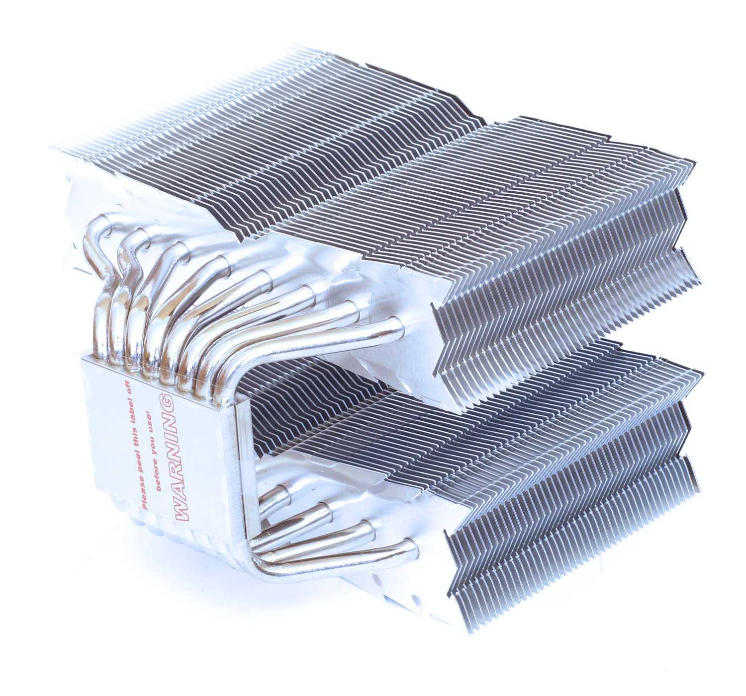 Профиль пластин имеет оригинальную форму и заметно, что на краях предусмотрены крепления для установки дополнительных вентиляторов с внешних сторон секций. Что несколько огорчает, но не критично– отсутствие колпачков на концах тепловых трубкок. Подобные колпачки использовались в кулере Thermalright Silver Arrow IB-E, но видимо сработал эффект экономии.