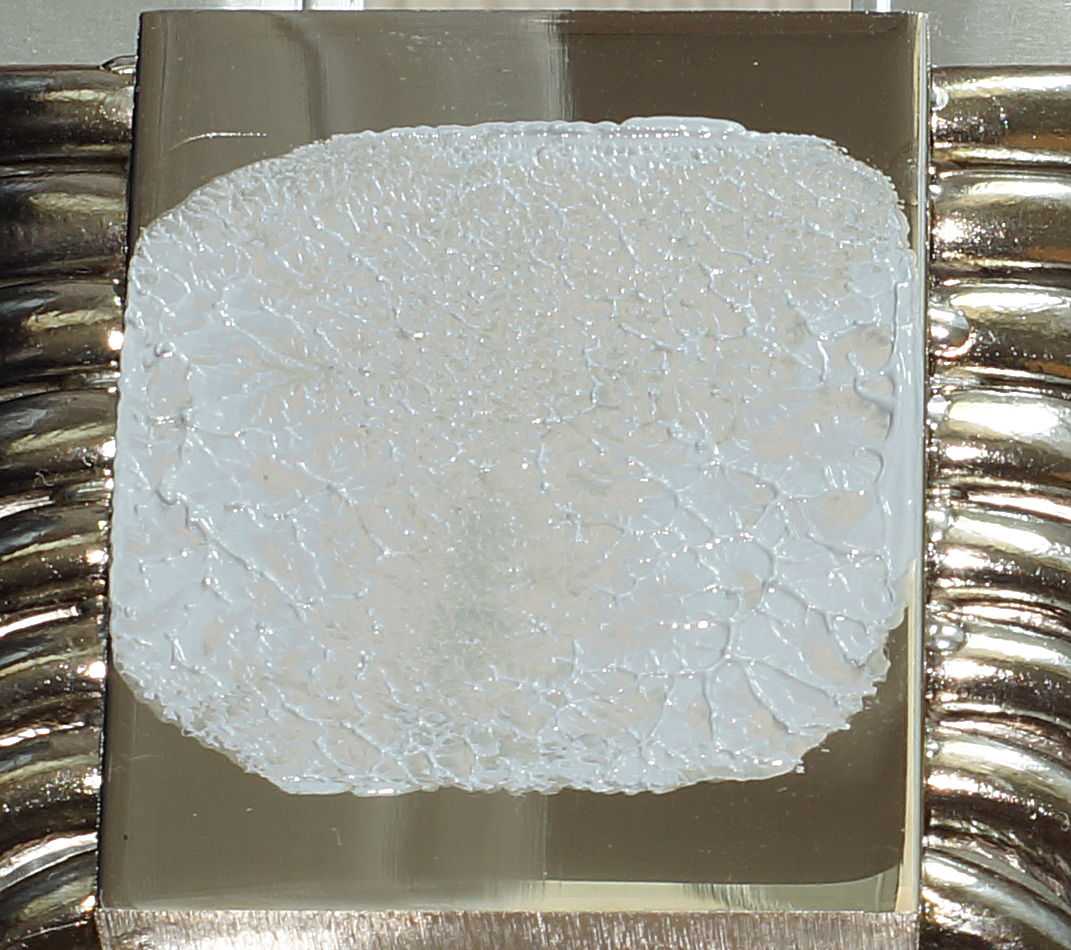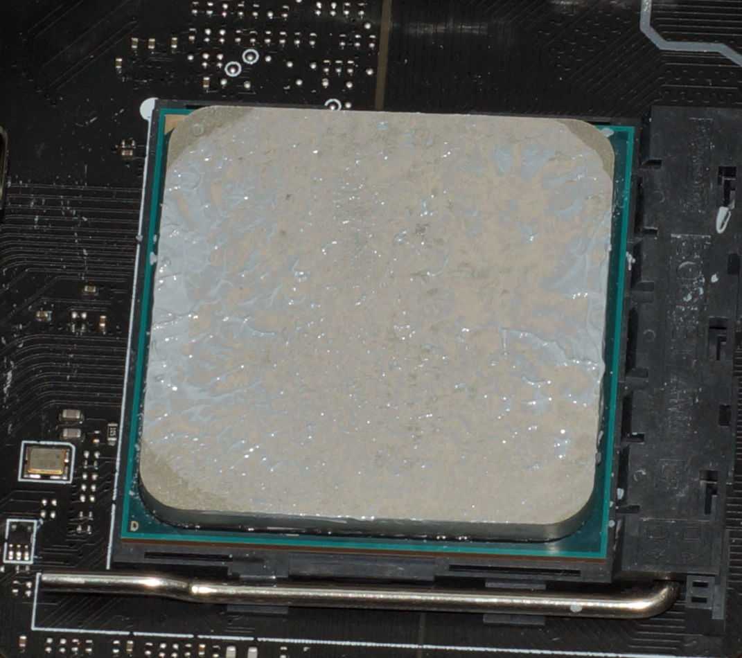 Отпечаток соответствующий. Только центральная часть основания получила хороший контакт, а дальше заметны не вытесненные области термопасты внутри.